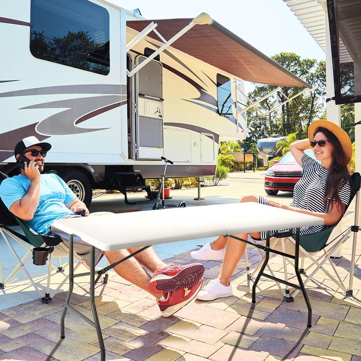 Der klappbare Gartentisch ist aus hochwertigen Materialien gefertigt, um Langlebigkeit und Benutzerfreundlichkeit zu gewährleisten. Die Tischplatte besteht aus HDPE, das für seine Langlebigkeit und geringen Wartungsaufwand bekannt ist, während der robuste Stahlrahmen für hervorragende Stabilität sorgt. Der Tisch verfügt außerdem über Anti-Rutsch-Füße, die für einen sicheren Stand auf jedem Untergrund sorgen. Sein leichtes Design, gepaart mit einem bequemen Griff, macht den Transport zum Kinderspiel, sodass Sie ihn überallhin mitnehmen können, wohin Ihre Abenteuer führen.