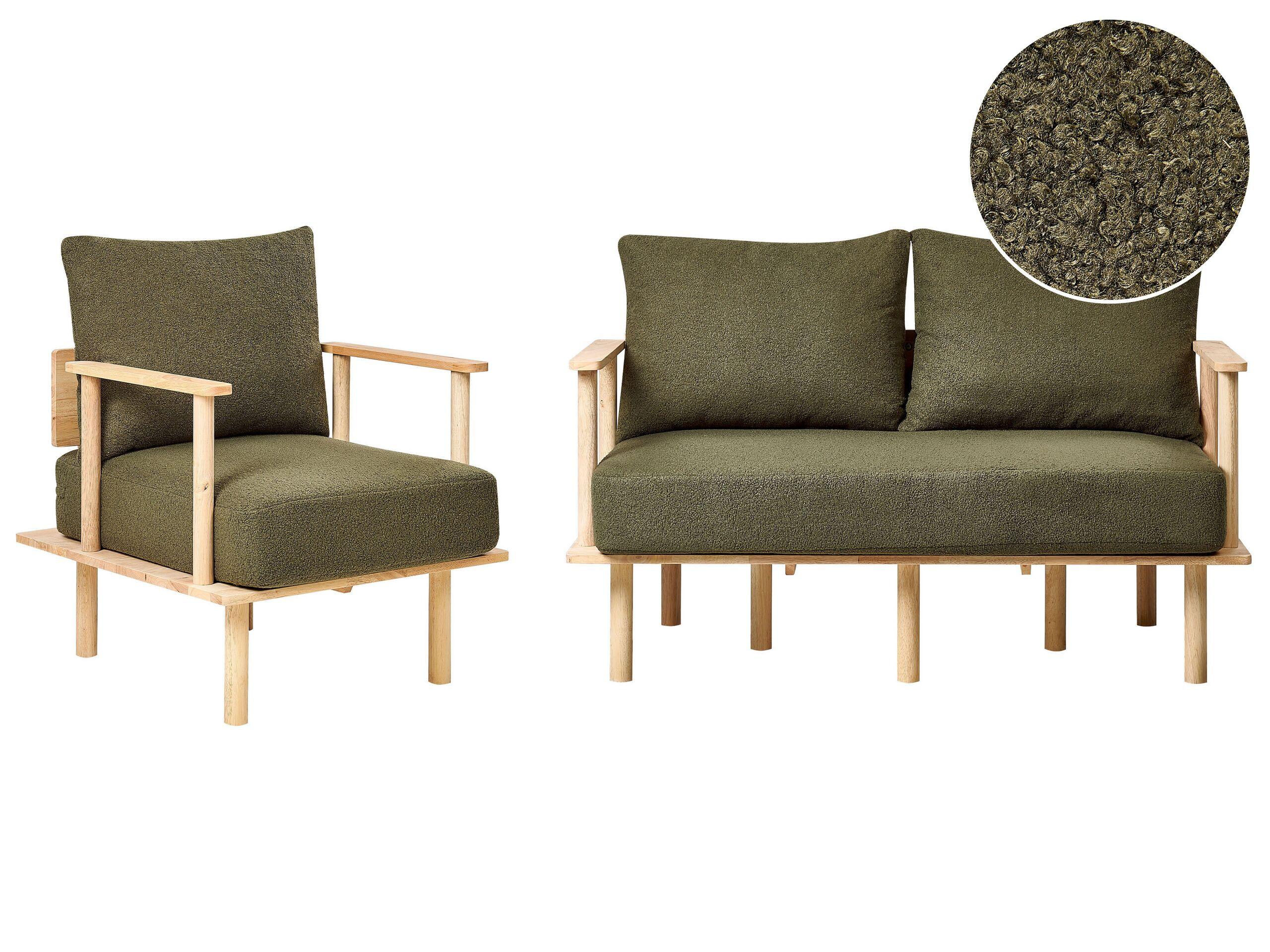 Minimalistisches Sofa und Sessel-Set. Dieses elegante Möbelset, bestehend aus einem 2-Sitzer-Sofa und einem Sessel, kombiniert minimalistisches Design mit natürlichen Holzelementen und ist die perfekte Ergänzung für moderne Wohnräume. Die weichen, dunkelgrünen Bouclé-Kissen sorgen für Komfort und Stil, während die robusten Holzrahmen für Langlebigkeit sorgen. Das Sofa- und Sessel-Set eignet sich sowohl zum Entspannen als auch als Blickfang und wertet mit seinem warmen, einladenden Charme mühelos jeden Raum auf.