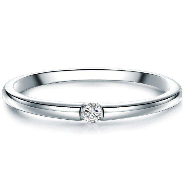 Understatement pur: Dieser elegante Verlobungsring von Trilani ist die richtige Wahl für alle Frauen, die edle Materialien und puristisches Design lieben. Eine besonders schmale Ringschiene aus anlaufgeschütztem 925er Sterlingsilber umfasst einen echten Diamanten mit 0,05 Karat. Der aufwändige Brillantschliff mit 57 Facetten bringt den Edelstein zum Funkeln. Außergewöhnlich ist die Fassung, die von der Optik eines Spannrings inspiriert wird, die Ringschiene aber nahezu unsichtbar auf der Rückseite fortführt, so dass der Diamant fest verankert ist. Ein Garant für ein begeistertes "Ja" beim Heiratsantrag und ein beliebter Vorsteckring.