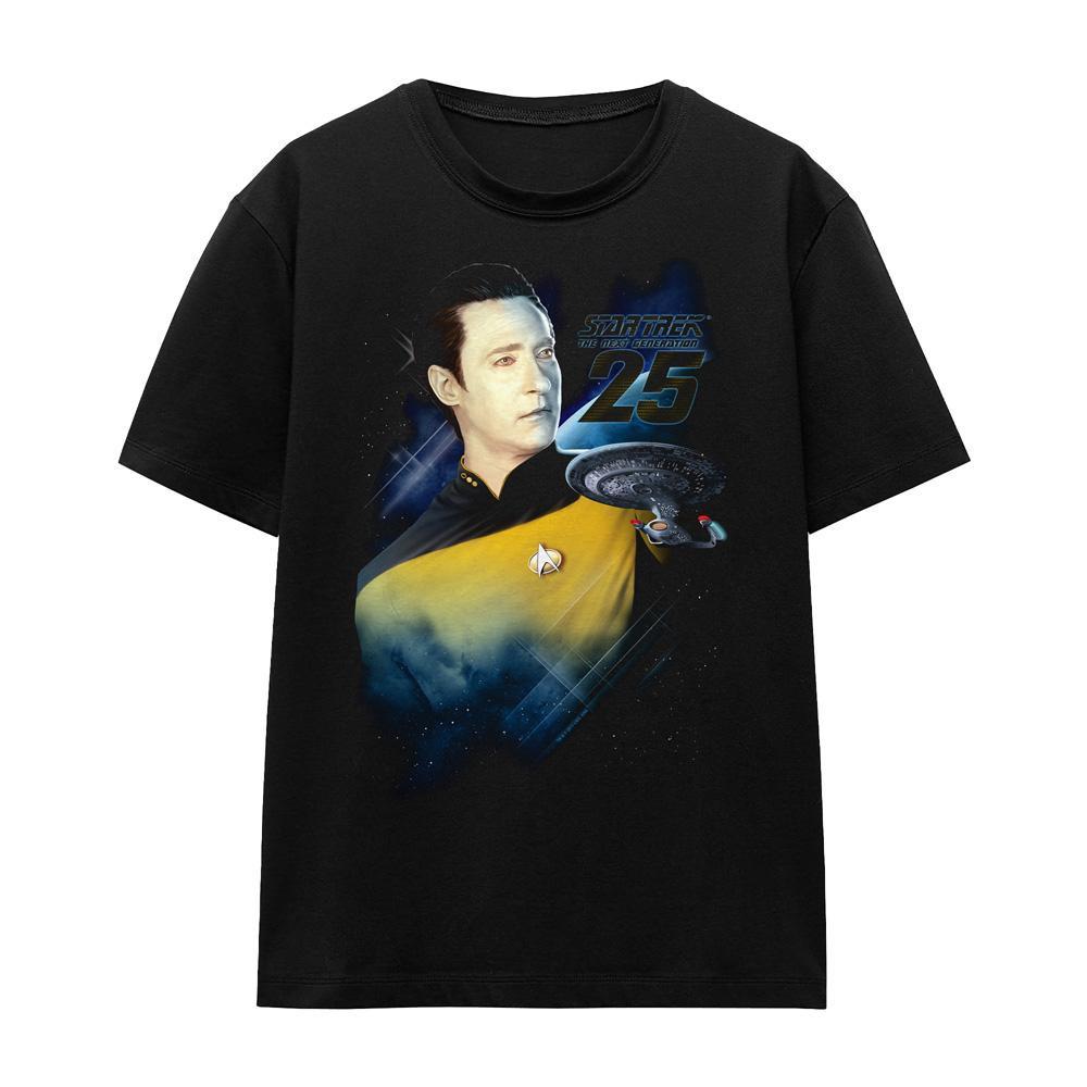Dieses Gedenk-T-Shirt feiert das 25-jährige Jubiläum von Star Trek: The Next Generation. Das Shirt zeigt einen auffälligen Grafikdruck von Data, einer prominenten Figur aus der Serie, zusammen mit der ikonischen USS Enterprise. Das Design ist vor einem kosmischen Hintergrund platziert und hebt das Logo 'Star Trek The Next Generation 25' hervor.