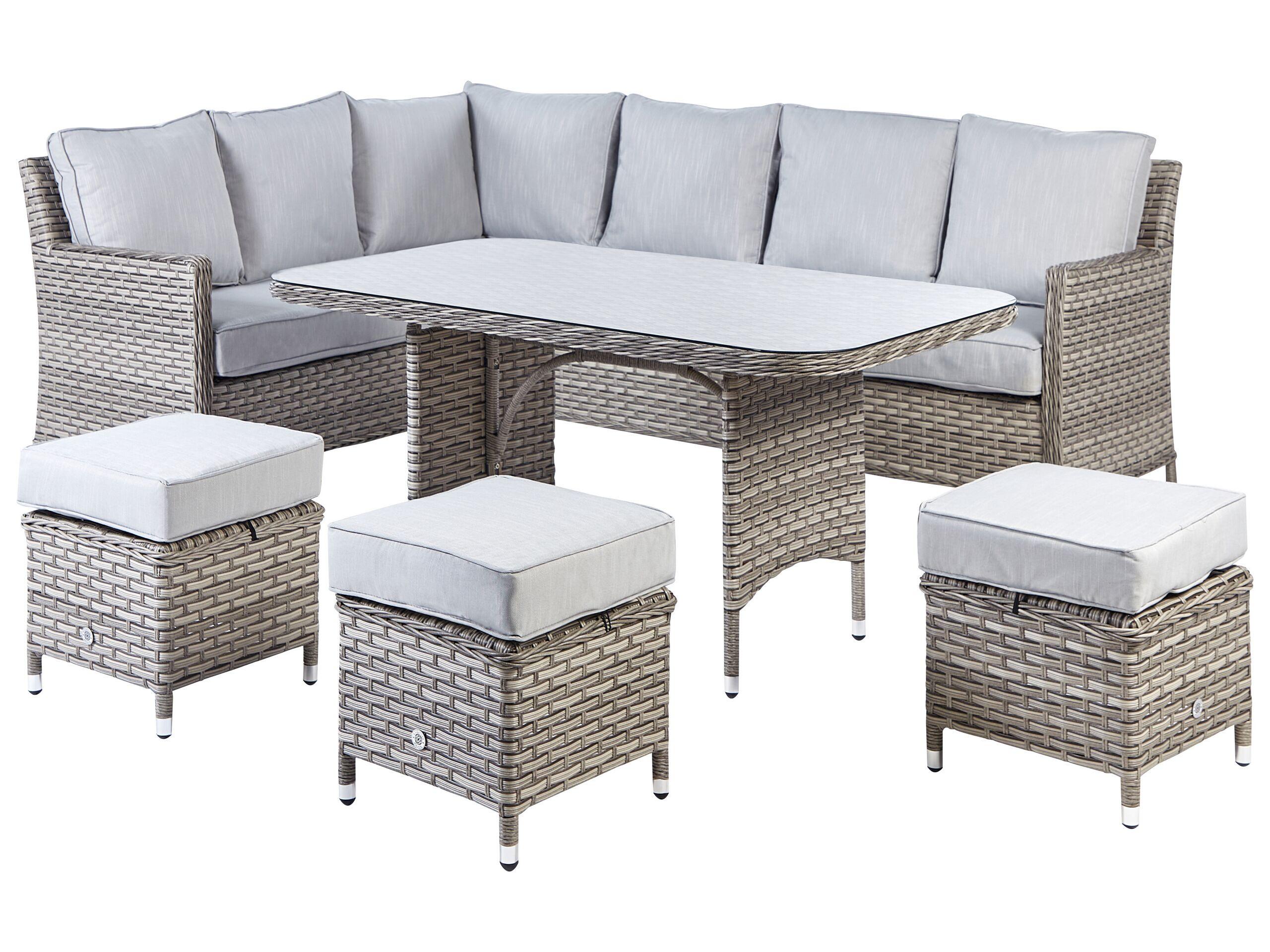 Gemütliches Gartenmöbel-Set aus Rattan. Verleihen Sie Ihrem Aussenbereich etwas rustikalen Charme mit diesem 6-teiligen Gartenset. Das einzigartige Geflecht aus Polyrattan verleiht dem Set einen stilvollen Vintage-Look, der wunderbar mit grünen Pflanzen harmoniert. Machen Sie es sich auf dem Ecksofa bequem oder nehmen Sie auf einem der drei Hocker Platz. Mit dem mitgelieferten Tisch aus Sicherheitsglas können Sie das Essen unter freiem Himmel geniessen. Mit enthalten im Set sind bequemen Kissen mit wasserabweisenden Bezügen.