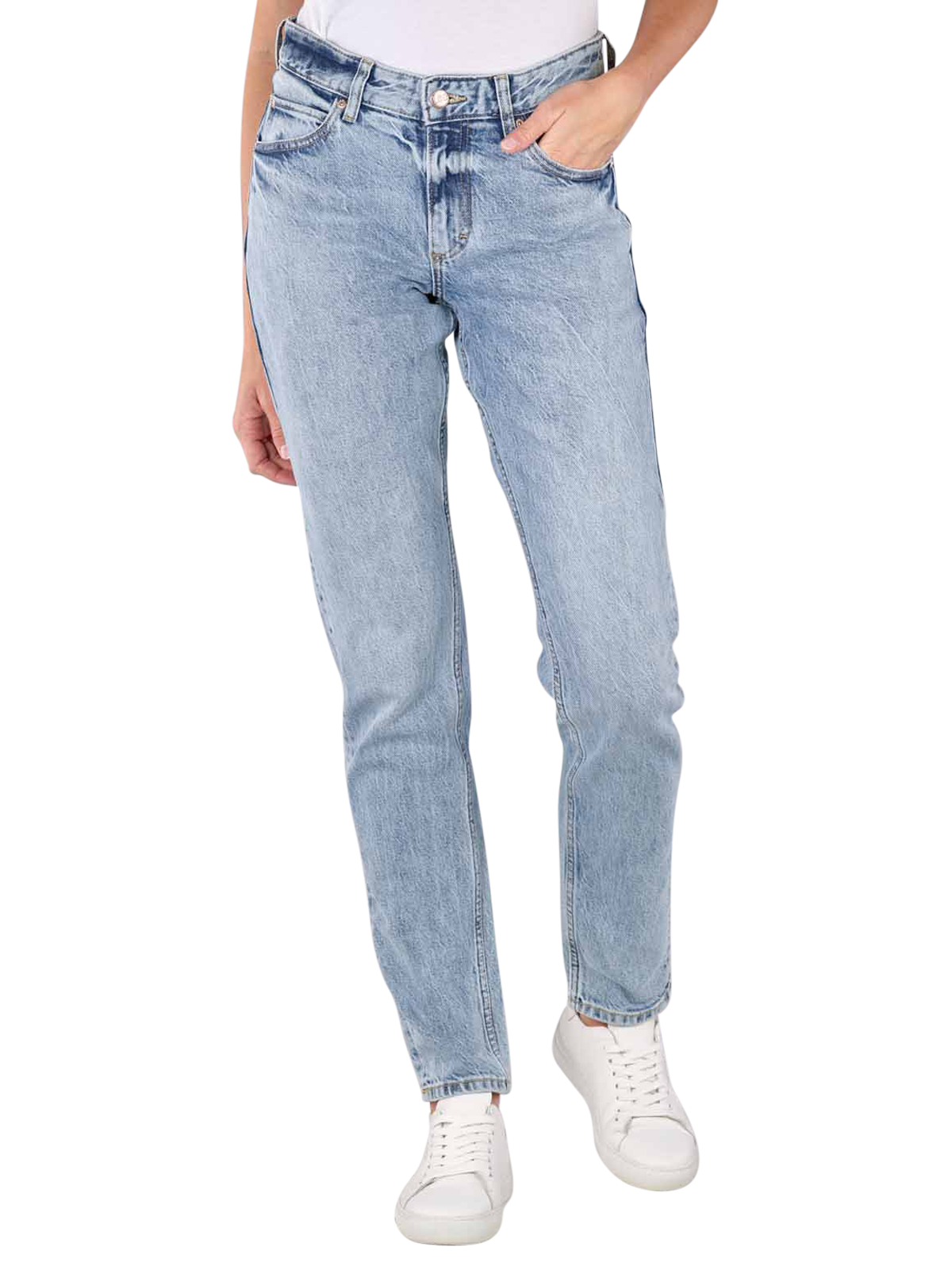 Diese hellblaue Jeans kombiniert eine Slim Fit- und Straight-Fit-Form mit Reissverschluss und Stretchanteil. Sie besitzt eine mittlere Bundhöhe, eng anliegende Oberschenkel und einen geraden Beinausschnitt. Die grossen Gesässtaschen sind jeweils mit der bekannten Welle gesteppt.