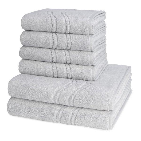Die Frottierserie Cashmere Feeling vereint edles Design mit höchstem Komfort. Das weiche Walkfrottee mit 520 g/m² bietet flauschigen Griff und hohe Saugkraft. Mit dekorativem Wellenmuster und gewebter Bordüre setzen die Tücher elegante Akzente im Bad. Dank praktischer Aufhänger-Kordel und brillanter Farben sind sie ideal für den täglichen Gebrauch. Set besteht aus: 4 X Handtuch (50 X 100cm), 2 X Duschtuch (75 X 140cm)