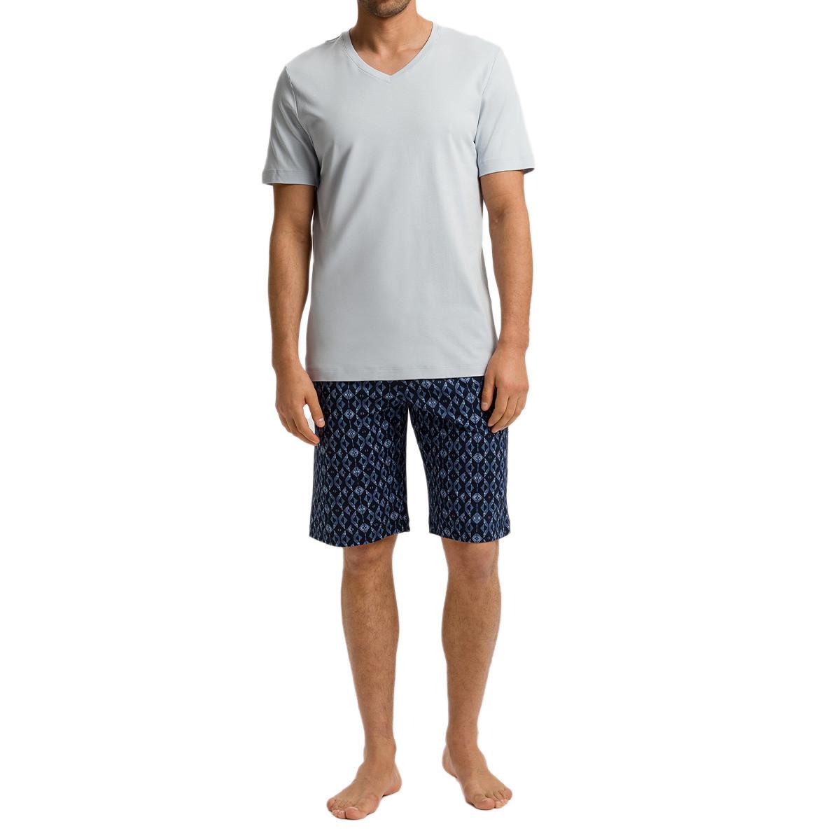 Dieser kurze Schlafanzug aus weichem Jersey-Interlock überzeugt mit hohem Tragekomfort und einem modernen Look. Das Set besteht aus einem unifarbenen T-Shirt mit V-Ausschnitt und einer gemusterten Shorts, die gemeinsam für entspannte Nächte und stilvolle Wohlfühlmomente sorgen. Ideal für warme Nächte und gemütliche Stunden zu Hause.