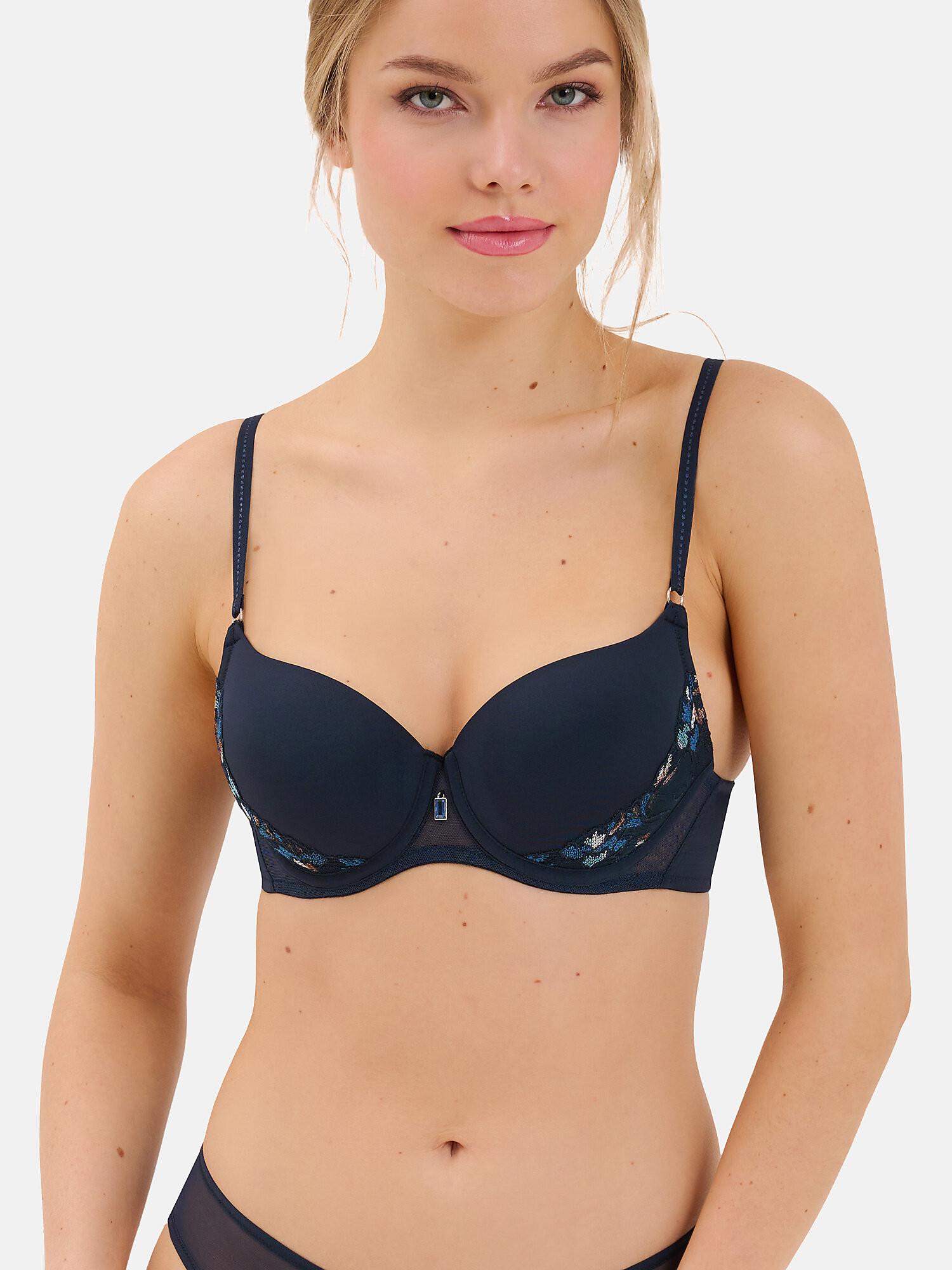 Nahtlose, glatte Cups und ein gerader Ausschnitt sind vorhanden. Der untere Teil der Cups ist für eine schönere Form mit weichem, elastischem Tüll unterlegt. Die Cups und die eingenähten Bügel bieten einen hervorragenden Halt. Die Träger und das Verschlussband sind für eine perfekte Passform verstellbar und in größeren Größen breiter. Die Ringe, Regulatoren und Ornamente auf der Vorderseite enthalten kein Nickel. Eine Metallverzierung mit einem Stein befindet sich in der Mitte.