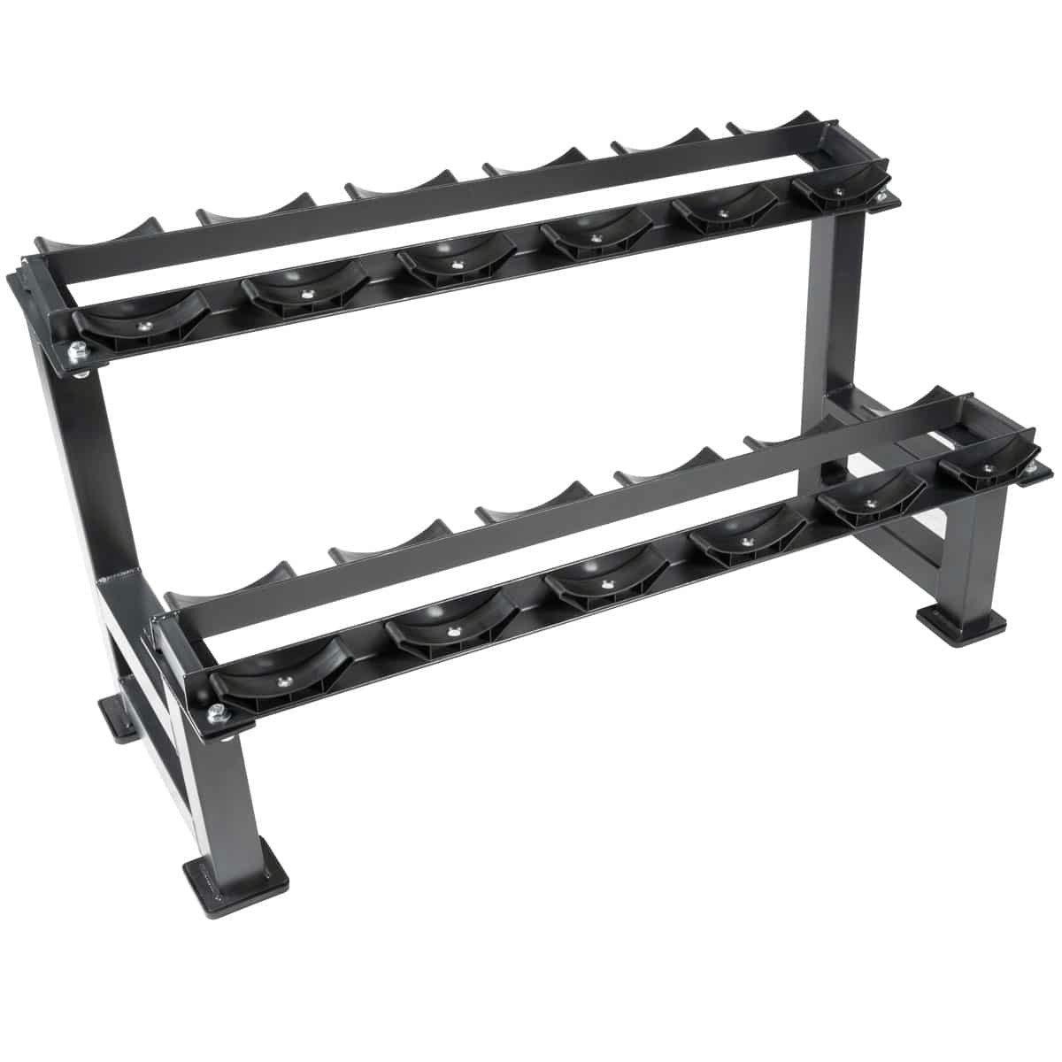 Optimieren Sie die Organisation Ihres Raumes mit dem GladiatorFit-Abteilungsgestell für 12 Hanteln. Diese zweistufige Ablage wurde für anspruchsvolle Clubs, Cross-Training-Boxen und Heimgyms entwickelt. Sie bietet Platz für bis zu 12 Hanteln (6 Paare), macht die Bodenfläche frei und verbessert die Sicherheit und den Zugang während des Trainings.