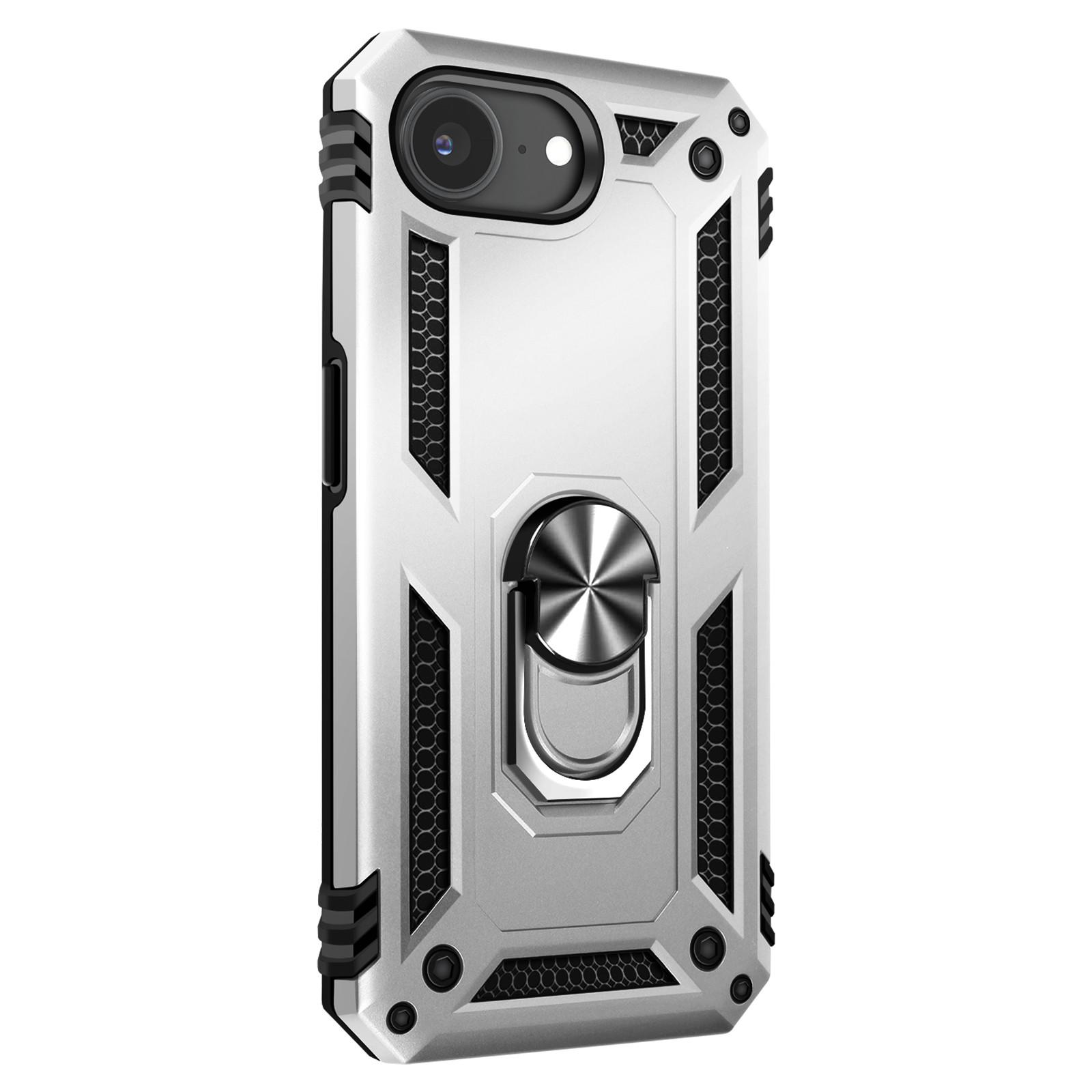 Silberne stoßfeste Zweikomponenten-Hülle für iPhone 16e. Stabile Rahmenkonstruktion und Silikon-Innenseite. Haltering, der in einen Videoständer umgewandelt werden kann. Kompatibel mit magnetischen Halterungen. Zugängliche Funktionen.