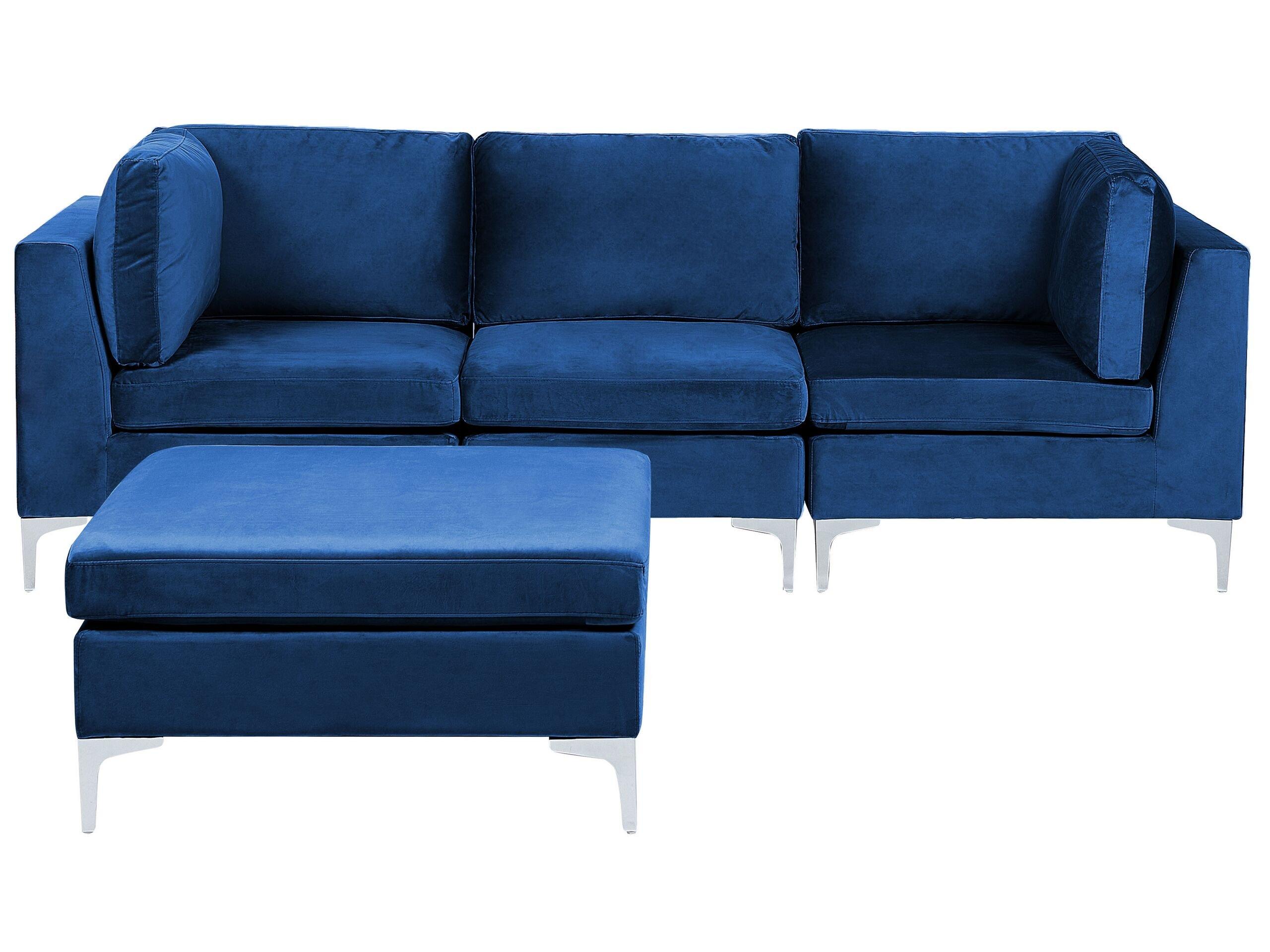 Klassisches Modulsofa für 3 Personen mit Pouf im trendigen Marineblau. Ob als selbstständige Möbelstücke oder als Modulelemente eines 3-Sitzer Sofas – diese Sitzelemente sind einfach vielseitig einsetzbar. Den Puf kann man als Abstellfläche für Zeitschriften oder Kaffeetassen, zusätzlichen Sitzplatz oder Fusshocker nutzen und ihn einfach an die Stelle verschieben, an der man ihn gerade braucht. Das Set besitzt einen hochwertigen Rundumbezug aus Samtstoff, sowie abnehmbare Kissenbezüge, weshalb es auch für Familien mit Kleinkindern oder Tierliebhaber eine gute Wahl sein wird. Die trendige Farbgebung in Marineblau korrespondiert ausgezeichnet mit den verchromten Metallbeinen in Silberoptik, weshalb die Couch äusserst modern, edel und einladend wirkt.
