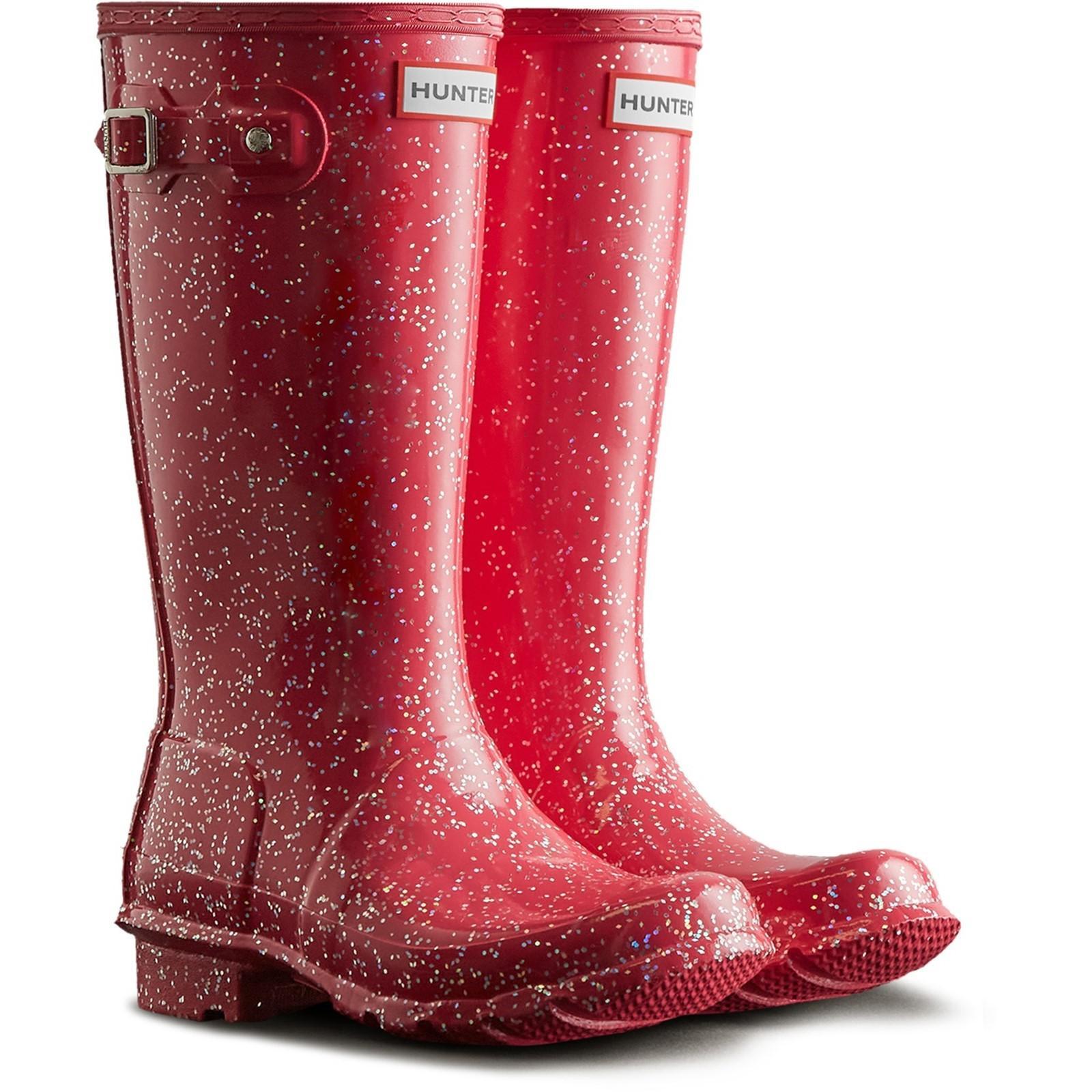 Marke: Hunter. Obermaterial: Vulkanisierter Gummi. Futterstoff: Polyester, recyceltes Material. Laufsohle: Gummi. Handgemacht, Reflektierende Details. Gewebetechnik: Wasserfest. Absatz: Niedriger Absatz. Wadenmitte. Design: Schnalle, Glitzer, Logo. Zehenstil: Rund. Zum Überziehen. Nachhaltigkeit: Vegan.