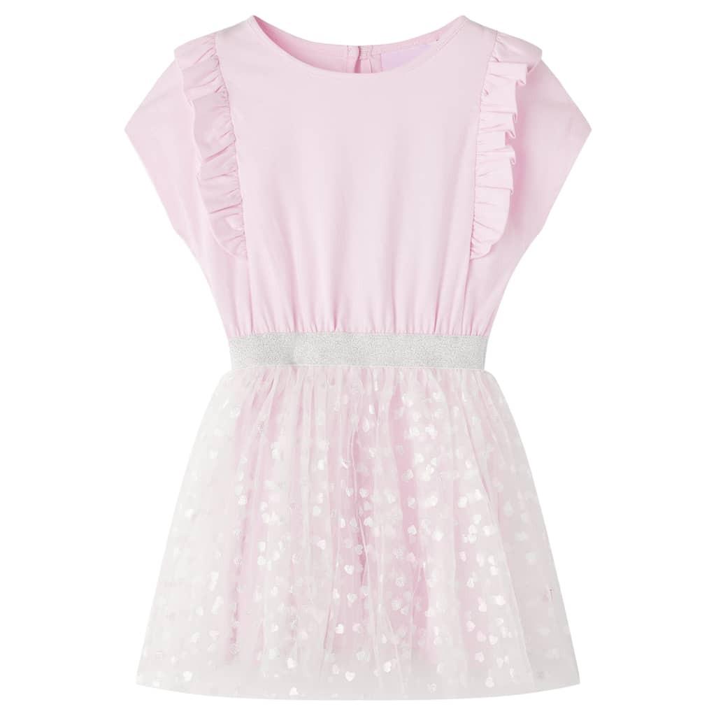 Dieses Kinderkleid hat kurze Ärmel, einen Rundhalsausschnitt und wird am Hals mit einem Knopf geschlossen. Dieses hellrosa Kinderkleid ist mit lieblichen Rüschen an der Vorderseite entlang des Ärmeleinsatzes versehen. Der luftige Tüllrock mit glänzenden Herzen vervollständigt das Kleid. Das kurze Kinderkleid ist aus weichem Material gefertigt, das aus Baumwolle, Elastan und Polyester besteht und daher nicht nur komfortabel, sondern auch atmungsaktiv ist.