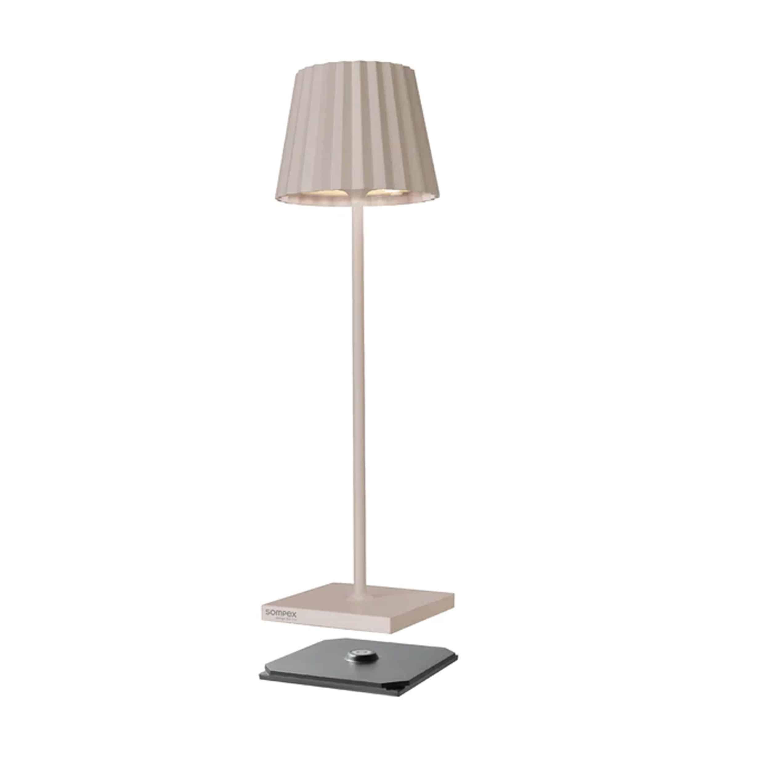 Die Sompex Troll LED-Tischleuchte eignet sich dank Spritzwasserschutz und integriertem Akku für den Aussen- sowie Innenbereich ohne direkten Stromanschluss. Die LED-Tischleuchte lässt sich per Touch-Button Ein- und Ausschalten und ist dimmbar.Moderne LED-Stehleuchte mit Akku für Garten und mehr:Spritzwassergeschützt (IP54), stufenlos dimmbarAkkulaufzeit 24 Stunden, 2,2 Watt LED, 3000 Kelvin, 188 LumenMaterial: Aluminium - Abmessungen: Höhe 38cm, Ø Schirm 15cm, Fuss 10 x 10cmDie Zeit, um den Akku wieder vollständig aufladen zu können beträgt 6hFarbe: beige Youtube-Video