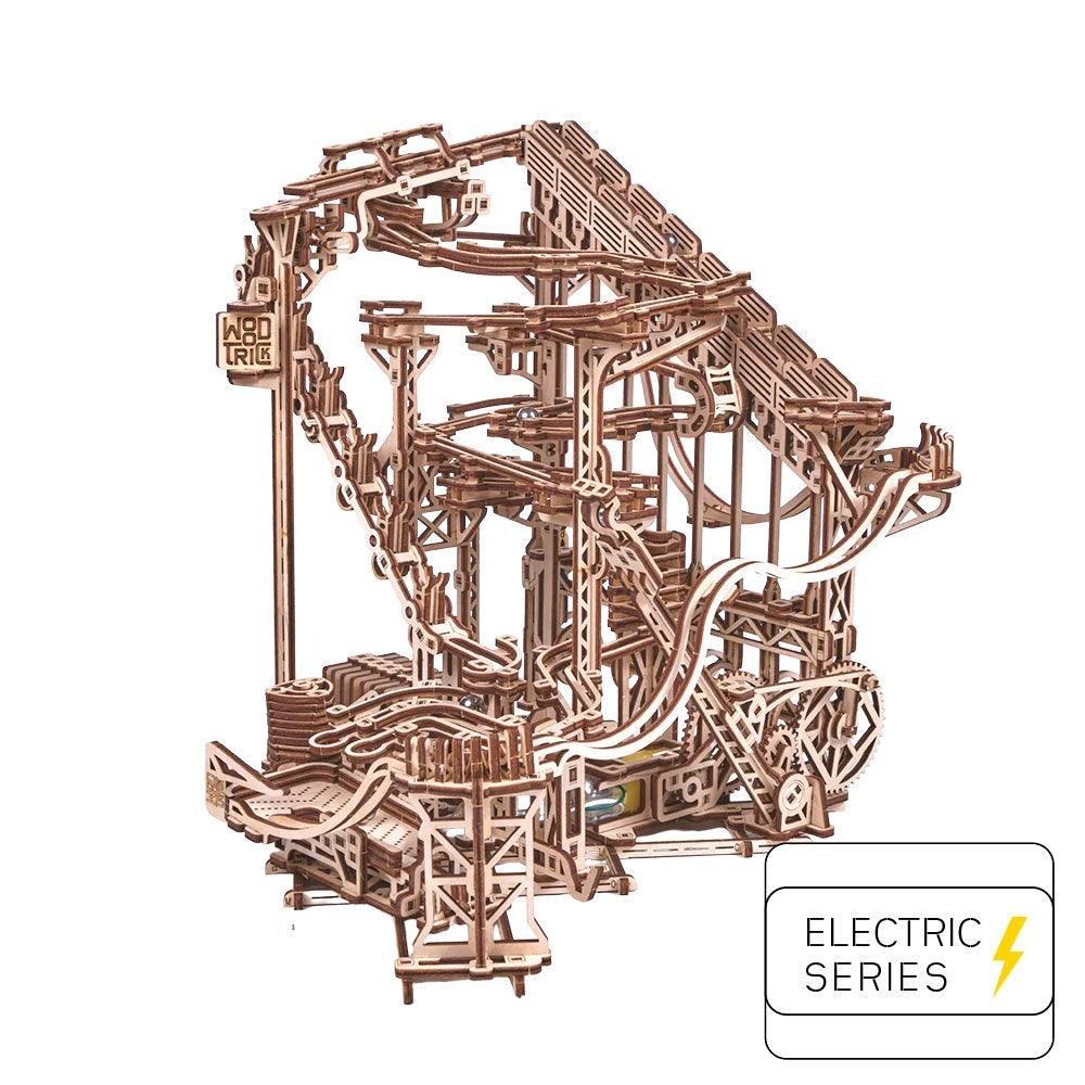 Elektrische Kugelbahn aus Holz mit 557 lasergeschnittenen Teilen. Kein Sägen, Schneiden oder Kleben nötig. Bauzeit von etwa 8 Stunden. Modellgrösse: 33,2 x 33,2 x 31,6 cm.