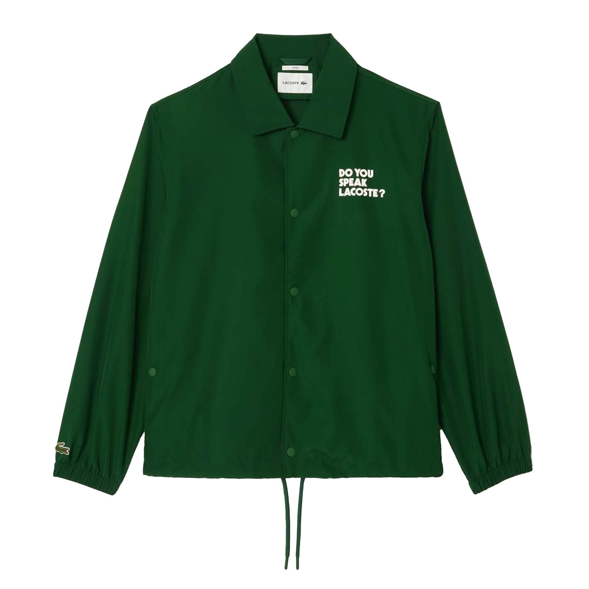 Diese leichte Trainerjacke verfügt über einen klassischen Kragen und einen durchgehenden Druckknopfverschluss für einen zeitlosen und doch sportlichen Look. Die Vorderseite ist mit dem spielerischen Text „DO YOU SPEAK LACOSTE?“ verziert, während die Rückseite denselben Satz in mehreren Sprachen zeigt, was einen einzigartigen globalen Touch verleiht.