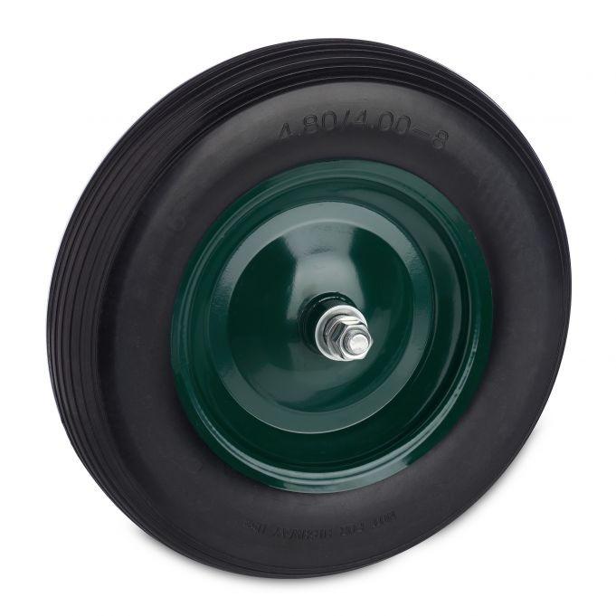 Das pannensichere Schubkarrenrad lässt sich dank der mitgelieferten Achse problemlos montieren und ist sofort einsatzbereit. Die Vollgummikonstruktion macht das Aufpumpen überflüssig und ist widerstandsfähig gegen Beschädigungen durch Schmutz.