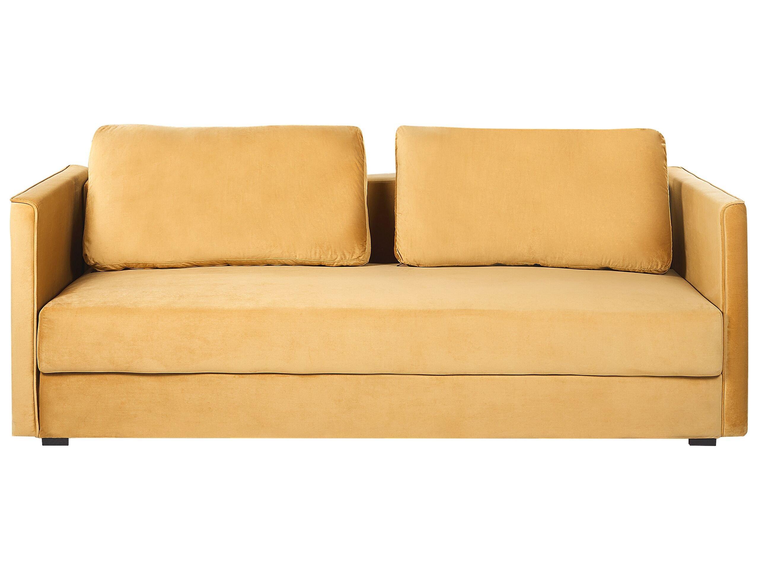 Modernes, senfgelbes Samtsofa mit praktischer Schlaffunktion und gerämigem Stauraum. Dieses klassische Sofa mit geschmeidigem Samtbezug ist immer ein Volltreffer. Es passt dank des universellen Designs zu jeder Eneinrichtung und punktet zudem mit seiner ausklappbaren Liegefläche – perfekt für Übernachtungsgäste. Das dick gepolsterte Sitzkissen und die zwei grossen Rückenpolster sorgen für ein angenehmes Sitzgefühl. Die Kissen der Rückenlehne sind mit einem abnehmbaren Bezug versehen, der leicht zu reinigen ist, sodass man sich keine Sorgen um Flecken machen muss. Ein weiteres Highlight: der Dreisitzer verfügt über eine Aufbewahrungsbox, wo sie Bettzeug und Zubehör blickdicht verstecken können.