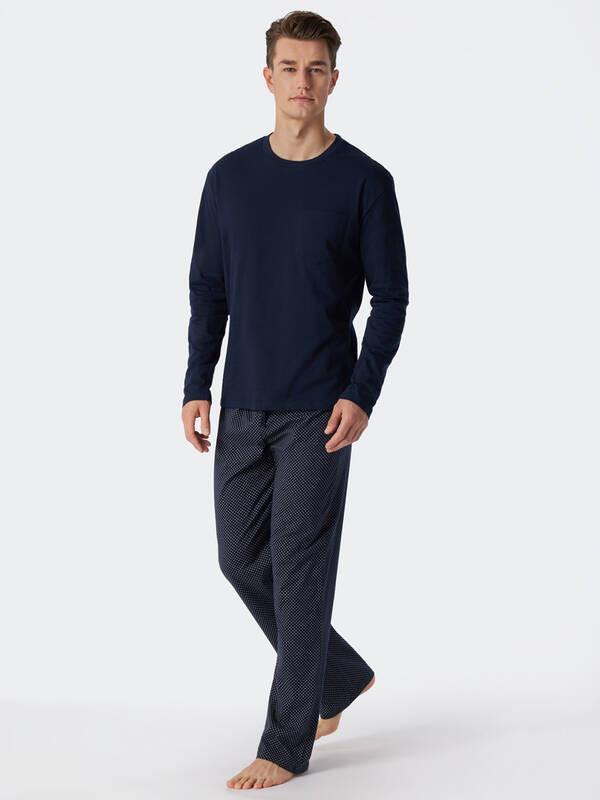 Dieses Langarm-Pyjama-Set bietet Komfort und Stil für entspannte Stunden zu Hause. Das Oberteil verfügt über einen klassischen Rundhalsausschnitt und eine praktische Brusttasche, während die Hose mit einem dezenten Allover-Muster und einem verstellbaren Kordelzugbund für eine perfekte Passform ausgestattet ist.