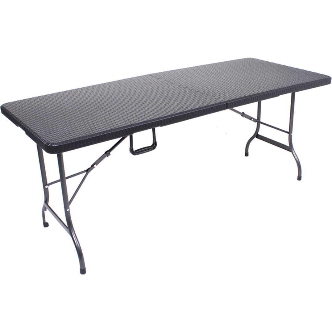 Entdecken Sie den atemberaubenden Tisch Mufaro in Geflecht-Optik - ein vielfältig einsetzbares und platzsparendes Meisterwerk der Möbelkunst. Gefertigt aus langlebigem Kunststoff Hdpe und robustem Stahl in elegantem Schwarz, bietet dieser klappbare Tisch eine grosszügige Tischplatte für gesellige Stunden im Freien. Sein modernes, zeitloses Design macht ihn zum perfekten Begleiter für jeden Einrichtungsstil und der praktische Klappmechanismus verwandelt ihn schnell und einfach in einen handlichen Koffer - ideal für die einfache Lagerung und den komfortablen Transport.