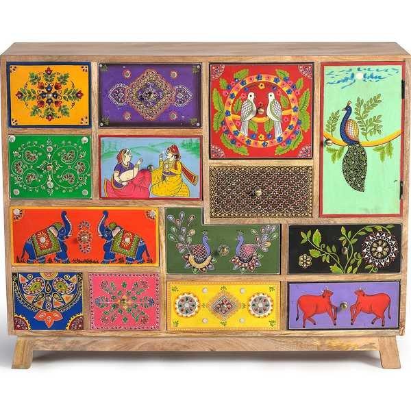 Kommode aus Mangoholz mit handgemalten Details, 13 Schubladen und 1 Tür.