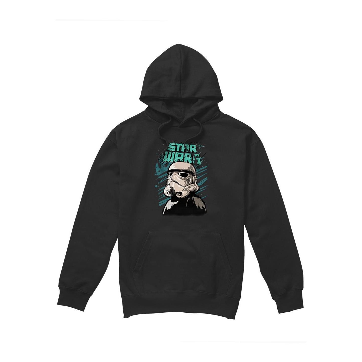 Dieser Kapuzenpullover zeigt einen auffälligen Grafikdruck eines Stormtroopers aus Star Wars und ist somit ein herausragendes Stück für Fans. Das Design wird durch das "STAR WARS"-Logo in einer dynamischen, stilisierten Schrift mit blauem und schwarzem Hintergrund ergänzt.