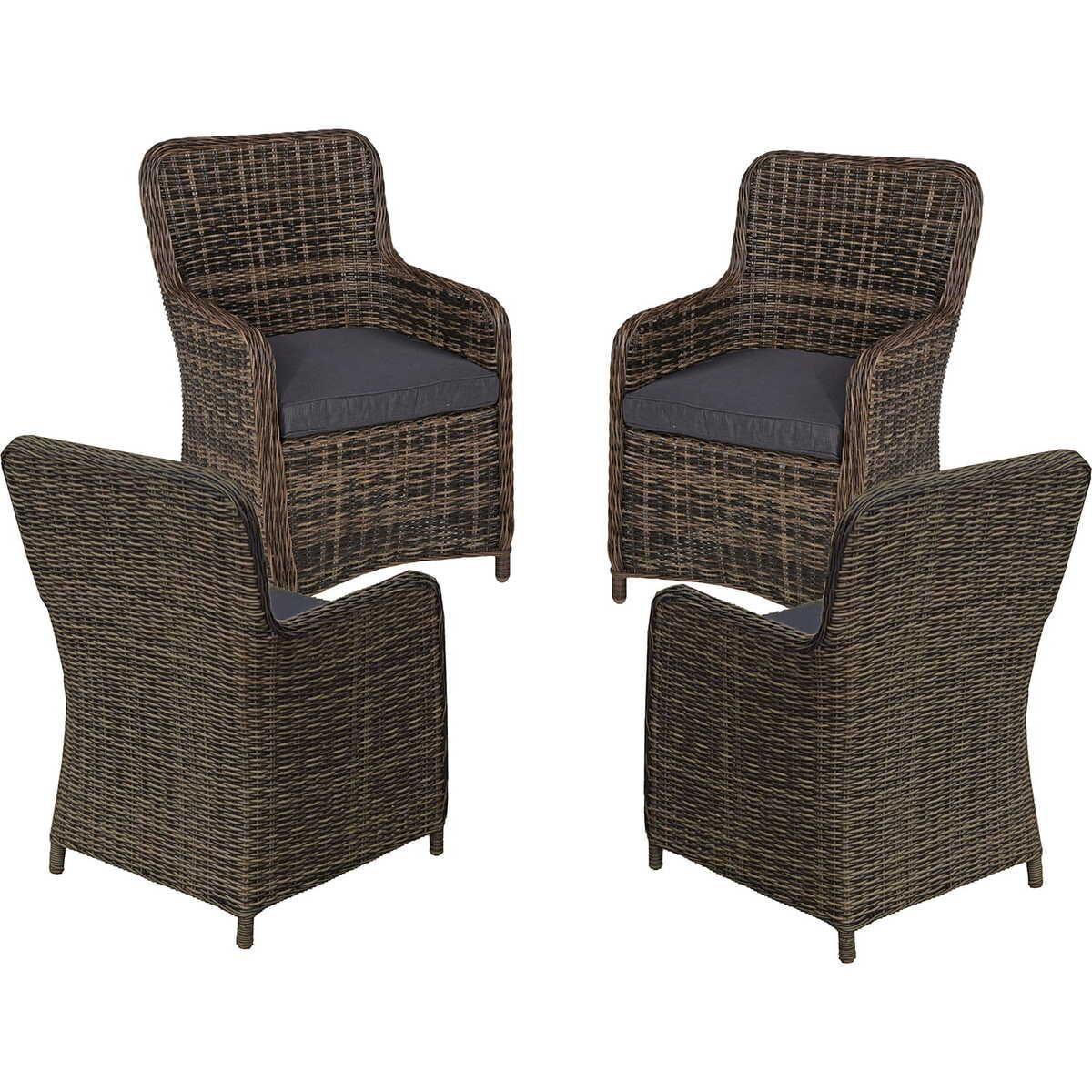 Pulverbeschichteter Stahl erhöht die Lebensdauer Nelkenbraunes Kunststoffgeflecht für ein attraktives Aussehen 100% Polyester Auflage für zusätzlichen Komfort Wetterfest und strapazierfähig, ideal für den Aussenbereich Stabil und langlebig mit einer maximalen Belastbarkeit von 110 kg Set aus vier Sesseln für den perfekten Outdoor-Entspannungsbereich