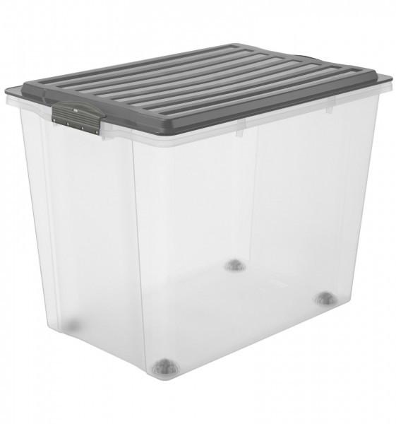 Breite: 39.5 cm, Höhe: 43.5 cm, Tiefe: 57 cm, Volumen: 70 l, Produkttyp: Aufbewahrungsbox, Verpackungseinheit: 1 StückEinfach verschiebbar dank vier RollenGefertigt aus transparentem KunststoffVolum