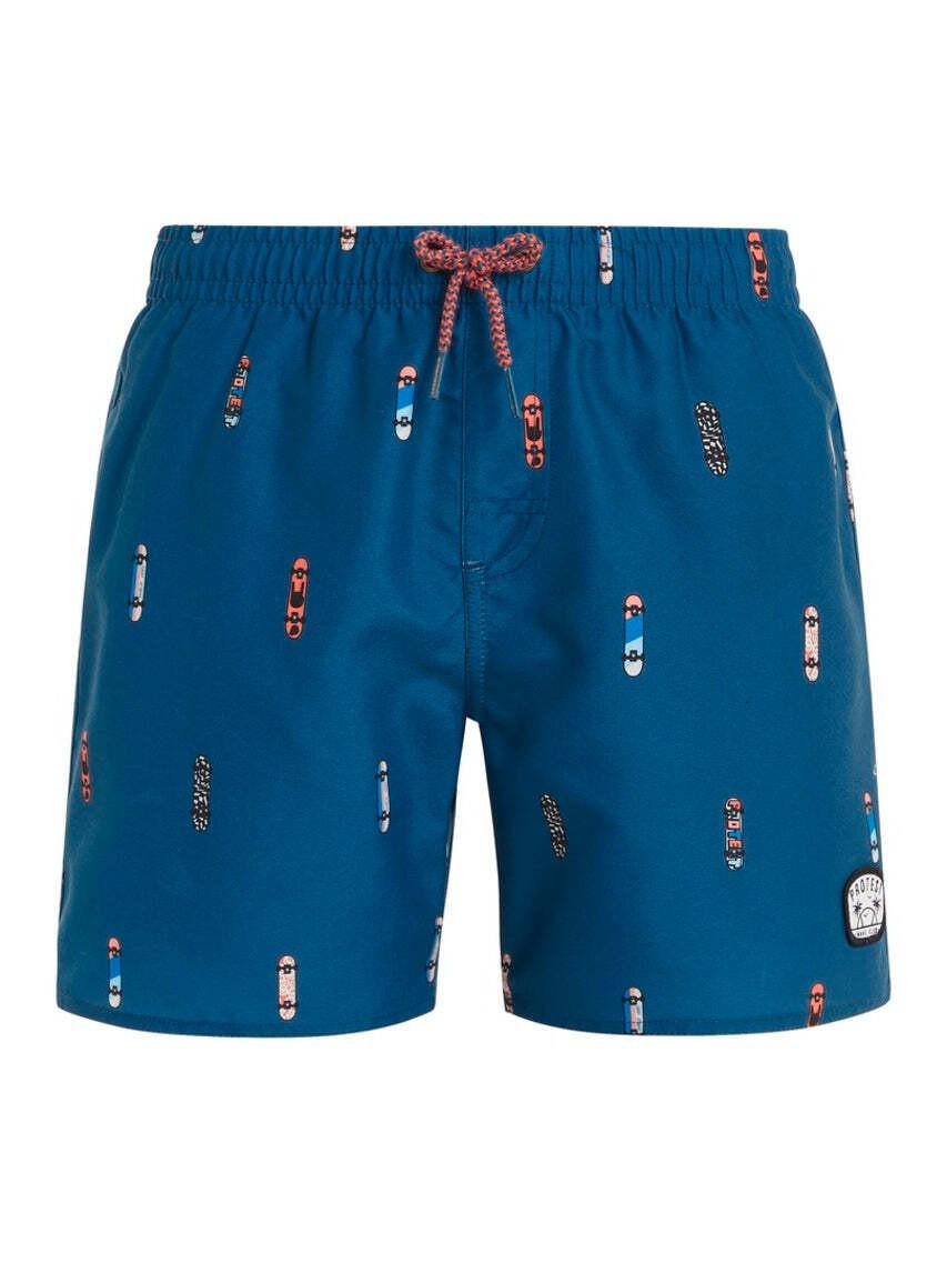 Hier ist die PRTCHRIS JR von Protest. Diese Beachshorts ist mit einem coolen Allover-Muster aus Mini-Skateboards bedruckt. Die PRTCHRIS JR hat eine normale Passform und Taille. Der elastische Bund mit Zugband macht sie so unglaublich bequem. Der Innenslip bietet zusätzlichen Schutz. Mit 35 cm hat diese Shorts eine kurze Länge. Hast du auch schon die praktische Gesässtasche bemerkt? Die PRTCHRIS JR von Protest ist eine Shorts für stil- und selbstbewusste Jungen.