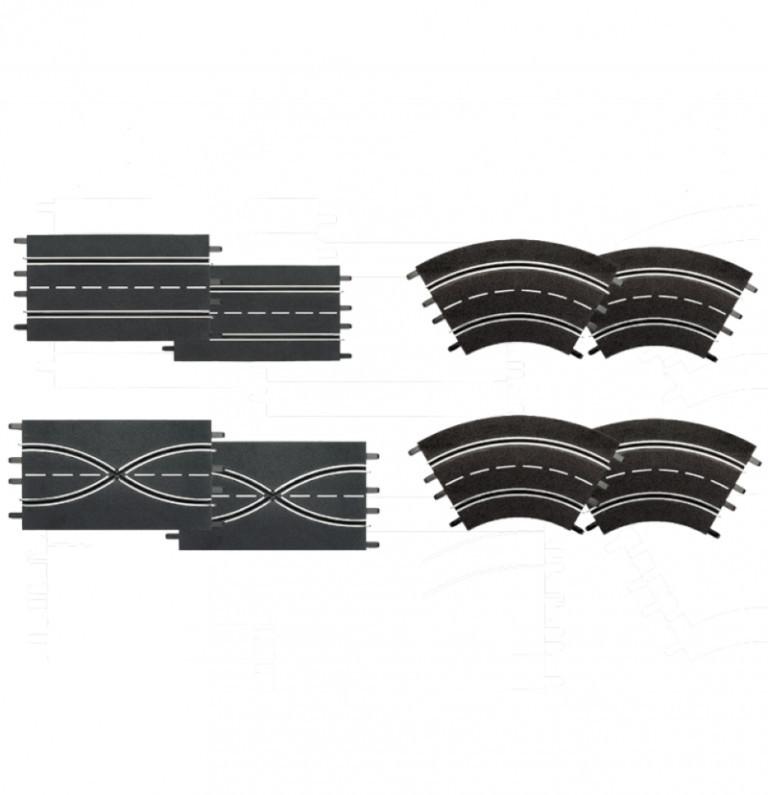 Set mit verschiedenen Schienen für die Rennstrecke. Enthält Standardgeraden, Spurwechselstücke und Kurven für die individuelle Erweiterung der Strecke.