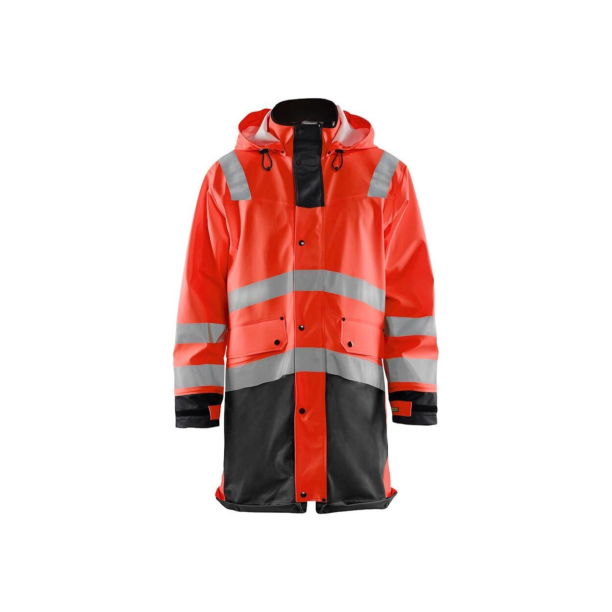 Dieser gut sichtbare, wind- und wasserabweisende Regenmantel verfügt über versiegelte Nähte und eine Belüftung im Rückenbereich. Er ist mit einer abnehmbaren und verstellbaren Kapuze mit Fleecekragen sowie reflektierenden Streifen ausgestattet. Die Jacke entspricht der Norm EN 343 für Wetterschutzkleidung und EN 20471, Klasse 3, für hochsichtbare Schutzkleidung.