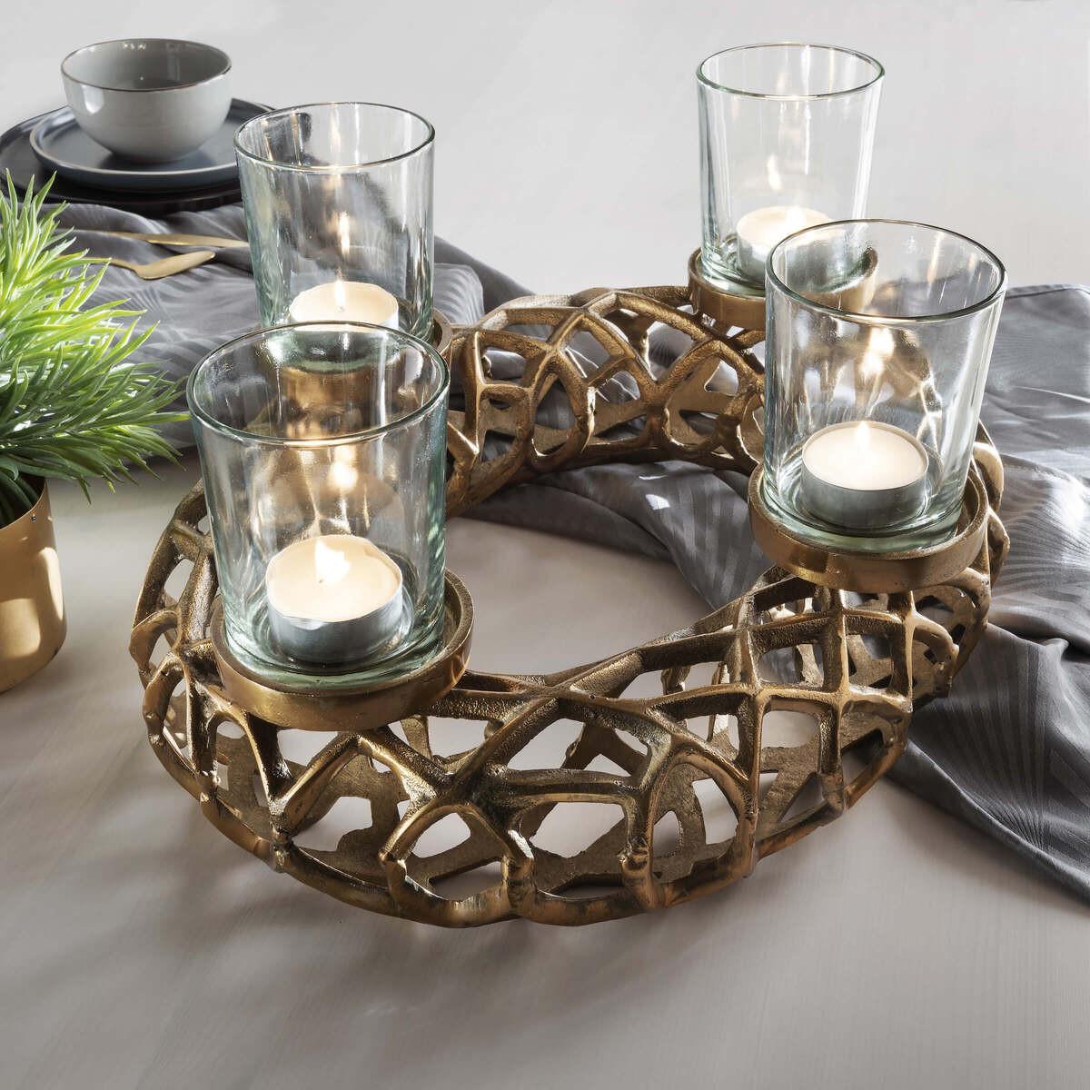 Deko-Kranz aus Eisen antik-gold mit 4 Teelicht-Gläsern.
