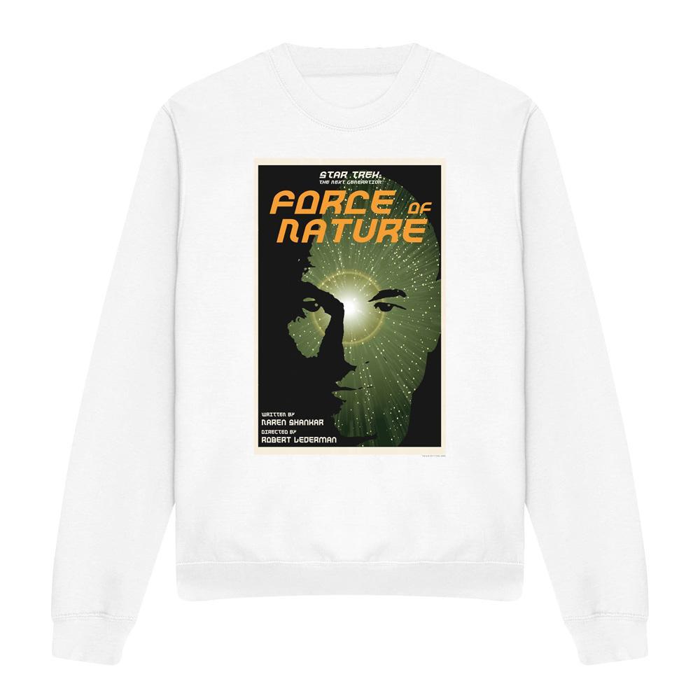 Dieses Sweatshirt zeigt einen einzigartigen Grafikdruck, inspiriert von "Star Trek: The Next Generation" Staffel 7 Episode 9, mit dem Titel "Force of Nature". Das Design präsentiert ein auffälliges Bild mit einer Silhouette vor einem kosmischen Hintergrund, das die Essenz des Themas der Episode einfängt. Es ist eine bequeme und stilvolle Ergänzung für die Garderobe jedes Fans.