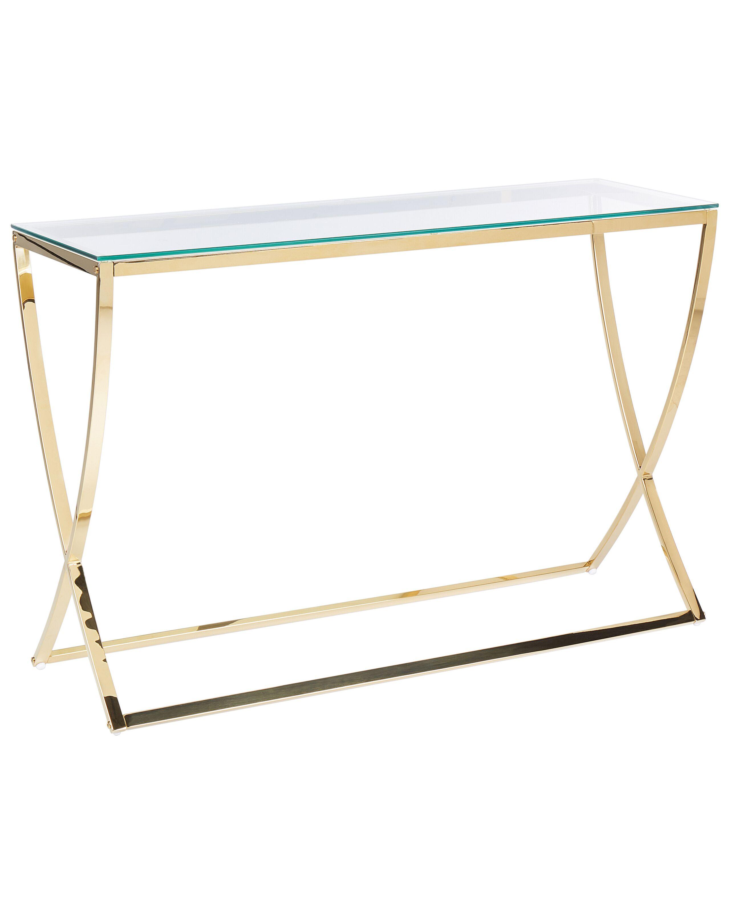 Konsole aus Edelstahl und Glas im Glamour-Stil. Ein eleganter Konsolentisch mit einem x-förmigen Gestell, der jedem Wohnraum einen Hauch von Glamour verleiht. Die Tischplatte aus Sicherheitsglas bildet zusammen mit den goldglänzenden Edelstahlbeinen einen edlen Mittelpunkt für Ihr Wohnzimmer, Schlafzimmer oder Flur. Dieser Tisch ist nicht nur äusserst stilvoll, sondern auch ein praktisches Möbelstück zugleich.