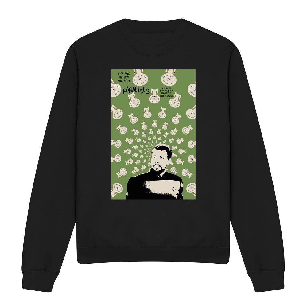 Dieses Sweatshirt zeigt einen einzigartigen Grafikdruck, inspiriert von "Star Trek: The Next Generation" Staffel 7 Episode 11, mit dem Titel "Parallels". Das Design zeigt Commander Riker inmitten eines wirbelnden Musters von Enterprise-D Brückenstühlen, das das Thema der Episode über alternative Realitäten widerspiegelt. Dieses bequeme Rundhals-Sweatshirt ist ein unverwechselbares Stück für Fans der ikonischen Science-Fiction-Serie.