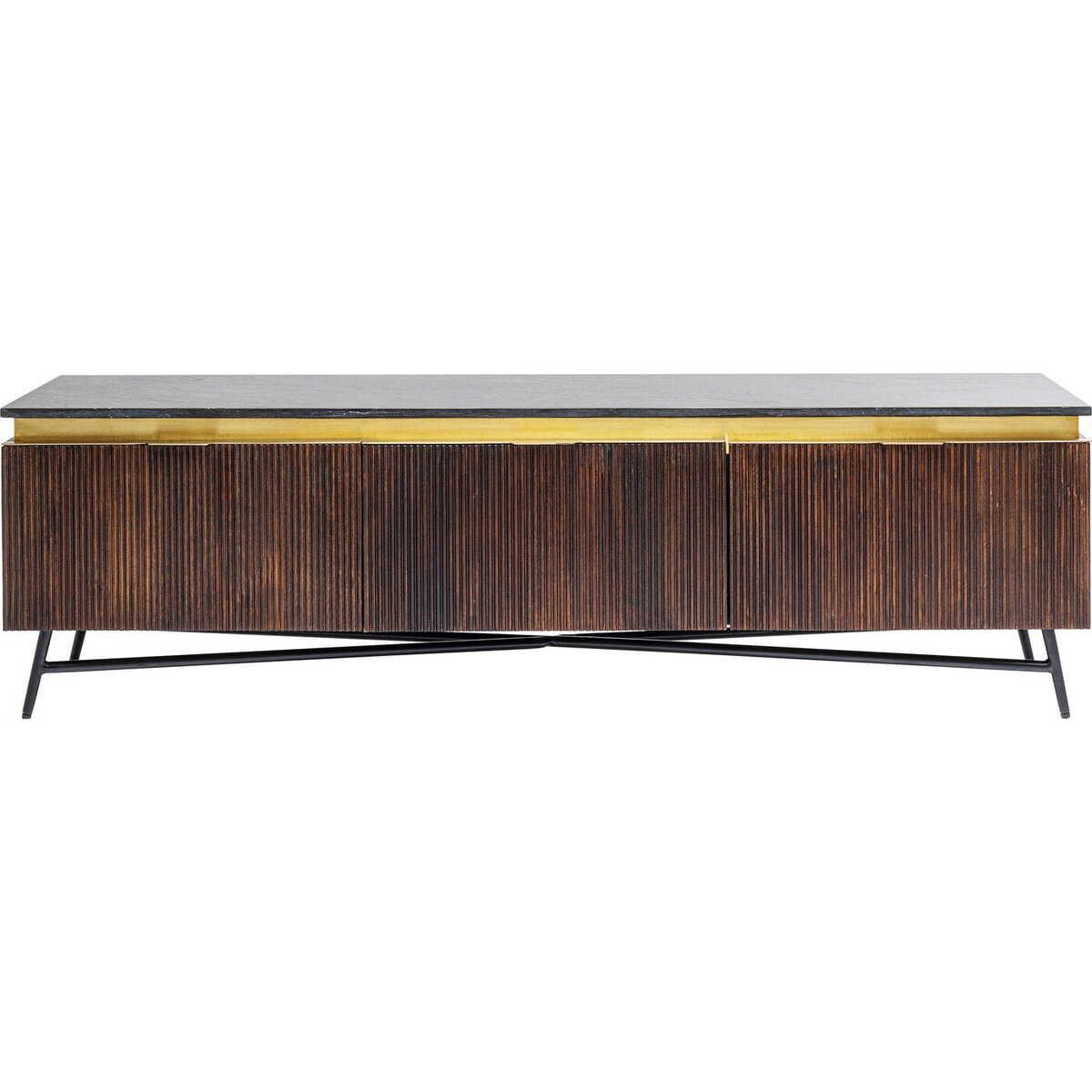So ein Schmuckstück von einem Lowboard hat nicht jeder: Das niedrige Stauraum-Möbel zeigt sich von aussen und von innen gut strukturiert. Die zwei Türen und eine Klappe mit versteckten Griffmulden sind mit massivem Mangoholz in Riffeloptik verkleidet. Dahinter sind Ihre Filmsammlung oder Deko-Objekte bestens aufgehoben. Die Krönung ist jedoch die Deckplatte aus Marmor (Mineralmarmor). Ob hier Ihr Fernseher Platz findet oder Ihre wertvollsten Deko-Objekte, ist ganz Ihrem guten Geschmack überlassen.Braunes Lowboard mit Gold-Highlight, das Massivholz und Marmor extravagant verbindetDie Fronten-Struktur und der goldene Sockel machen aus einem funktionalen Möbel ein Design-HighlightMit seinen Massen und Funktionen ist das Lowboard als TV-Möbel prädestiniertDrei praktische Öffnungen in der Rückwand lassen Kabel blitzschnell verschwindenHinter zwei Türen und einer Klapptür finden das Media Equipment oder Deko-Objekte mühelos PlatzProduktinformation Gestell: Stahl pulverbeschichtet, Korpus: Mango Massivholz lackiert und Türen, Rückwand: mitteldichte Faserplatte naturbelassen, Deckplatte: Mineralmarmor, Griffe: Stahl lackiert, Messing gebürstet (Verzierung unterhalb Deckplatte), 20 mm Plattenstärke, 30 kg max. Belastbarkeit, montiert
