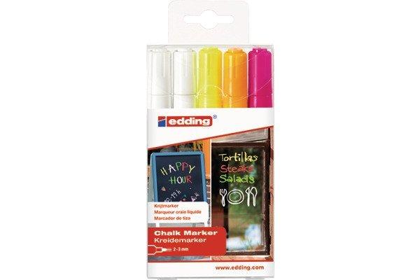 4095 - Kreidemarker - Sortiment Präzises Schreiben auf dunklen Tafeln und Glas - edding 4095 Kreidemarker. Kreidemarker zum Beschriften und Gestalten von z.B. Fenstern, dunklen Tafeln, Glas und Spiegeln. Leuchtende Farben, deckende, geruchsneutrale Flüssigkreide auf Wasserbasis Feucht abwischbar von fast allen geschlossenen Ober?ächen