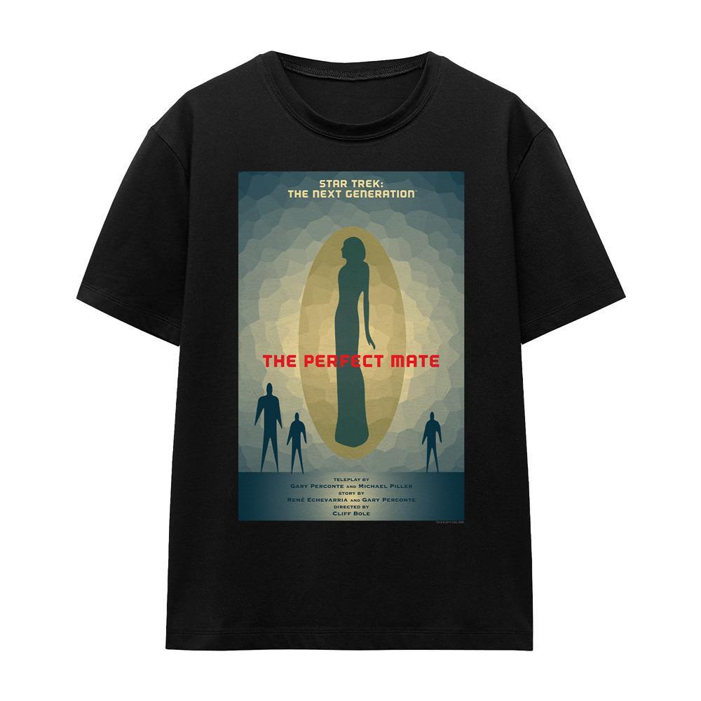 Dieses T-Shirt zeigt einen grafischen Druck, inspiriert von "The Perfect Mate", Staffel 5, Episode 21 von Star Trek: The Next Generation. Das Design fängt die Essenz des Episodenthemas mit einer stilisierten Darstellung von Charakteren und dem Episodentitel ein.