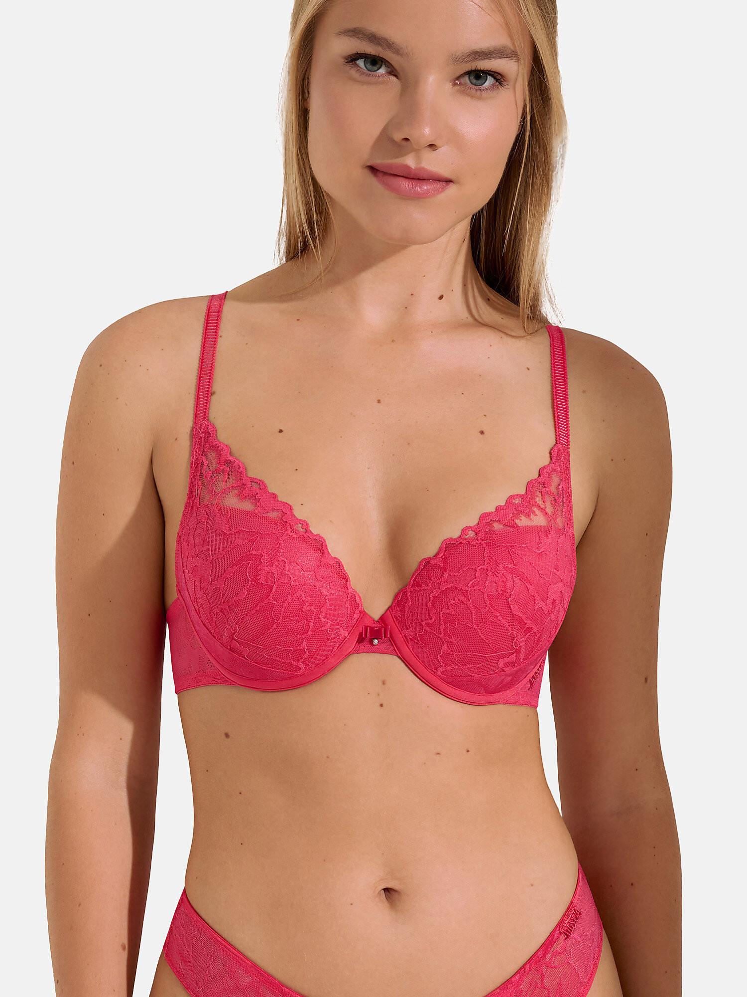 Attraktive, weiche und elastische Spitze mit einem trendigen, fließenden organischen Formmuster, kombiniert mit elastischem Strick und durchdachten Schnitten, verleiht einen verführerischen und anspruchsvollen Look. Diese Dessous sind für den täglichen Tragekomfort konzipiert und eine ausgezeichnete Wahl für Fans von Spitze und zeitlosen Dessous. Erhältlich in einem energiegeladenen Flamingo-Koralle und einem dunkleren, verführerischen Stahlblau. Die Körbchen sind in Kombination mit gestrickter Spitze gefertigt, was der Serie ein fesselndes Aussehen verleiht.