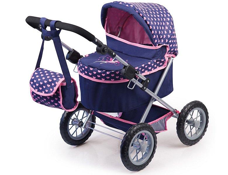 Der Puppenwagen Trendy Herzen begeistert mit einem charmanten Herzchen-Muster in lila. Dieser Wagen ist für Puppen bis 46 cm geeignet und hat eine höhenverstellbare Schiebegriffe von 39 bis 68 cm. Das zusammenklappbare Gestell sorgt für einfache Transportmöglichkeiten. Er kommt mit einer Umhängetasche und integriertem Korb für Spielutensilien. Die grossen Räder ermöglichen ein einfaches Fahren auf verschiedenen Untergründen.