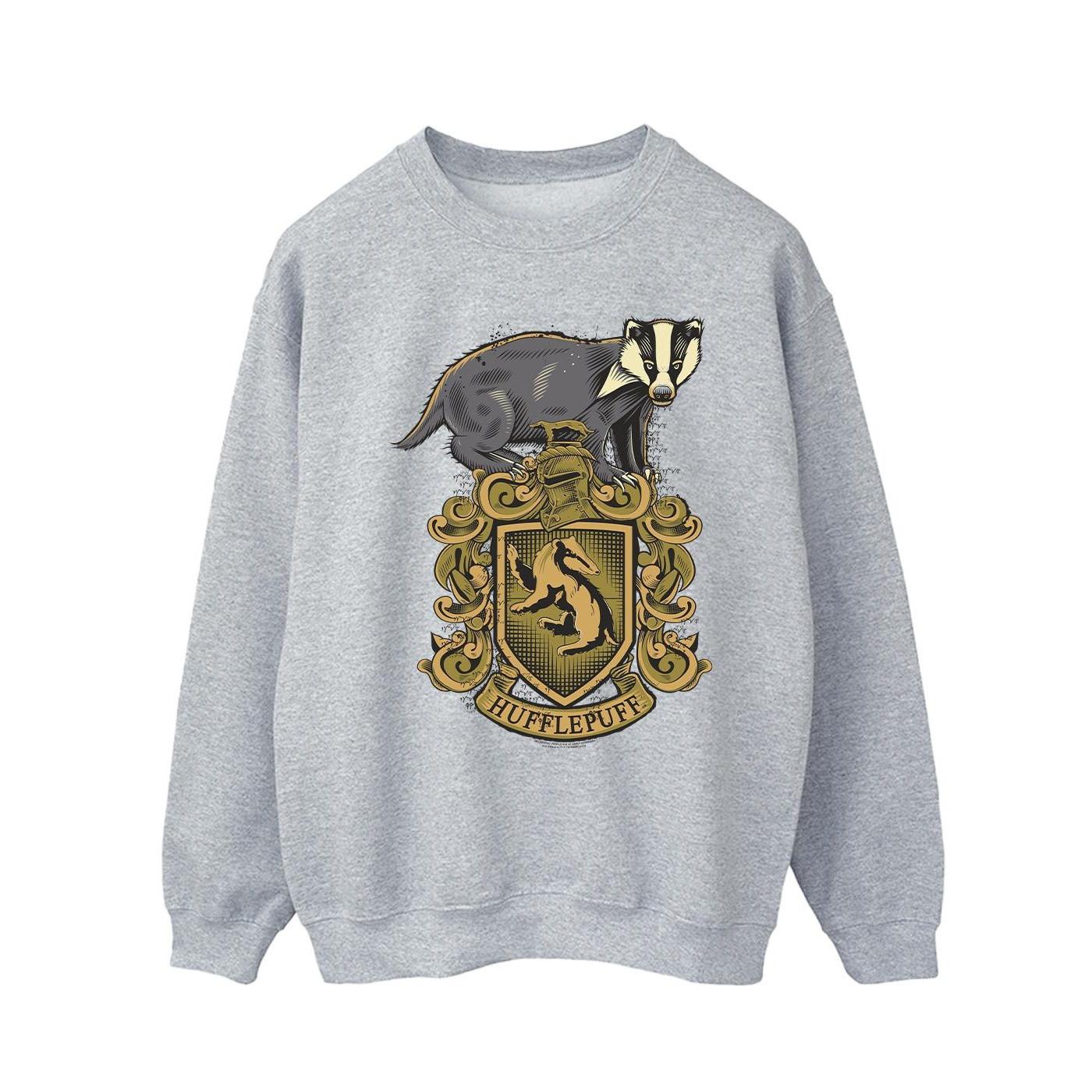 Dieses Rundhals-Sweatshirt zeigt einen prominenten Grafikdruck des Hufflepuff-Wappens, komplett mit seinem ikonischen Dachs-Maskottchen. Das Design ist auf der Vorderseite zentriert und macht es zu einem unverwechselbaren Stück für Fans.