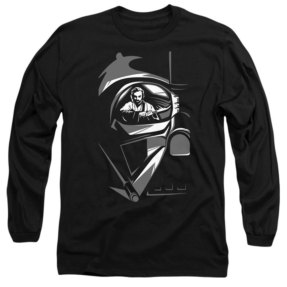 Dieses Langarm-T-Shirt zeigt einen auffälligen Grafikdruck von Obi-Wan Kenobi in einem Helmdesign, perfekt für Fans der Star Wars Saga. Der klassische Rundhalsausschnitt und die langen Ärmel bieten eine bequeme Passform für den Alltag.