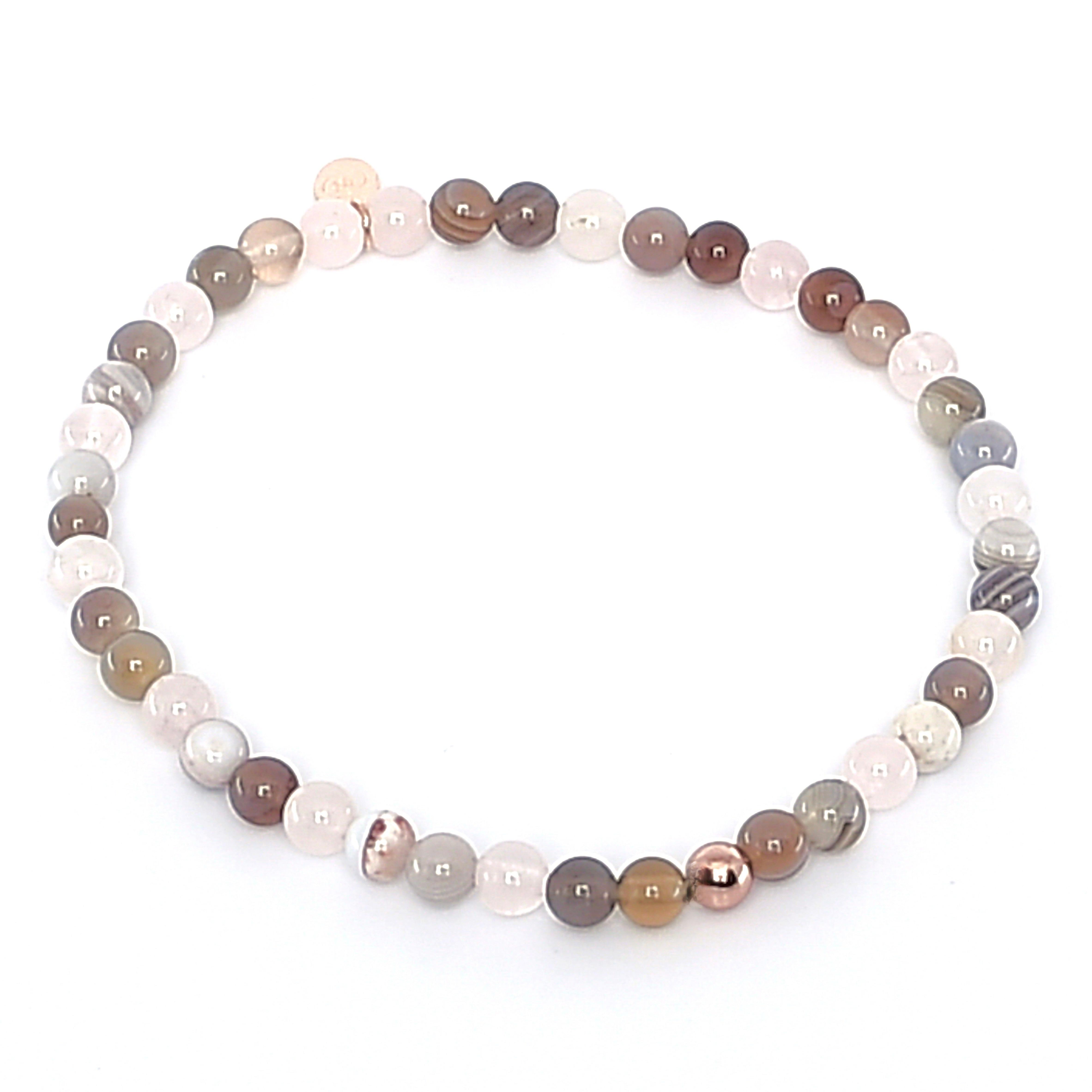 Dieses Damen Armband ist ein wahres Meisterwerk der Natur, das die beruhigenden Energien des Achat und des Rosenquarzes in perfekter Harmonie vereint. Die handverlesenen Steine werden durch eine rosé vergoldete Silberperle elegant ergänzt, die dem Design einen edlen und modernen Akzent verleiht.