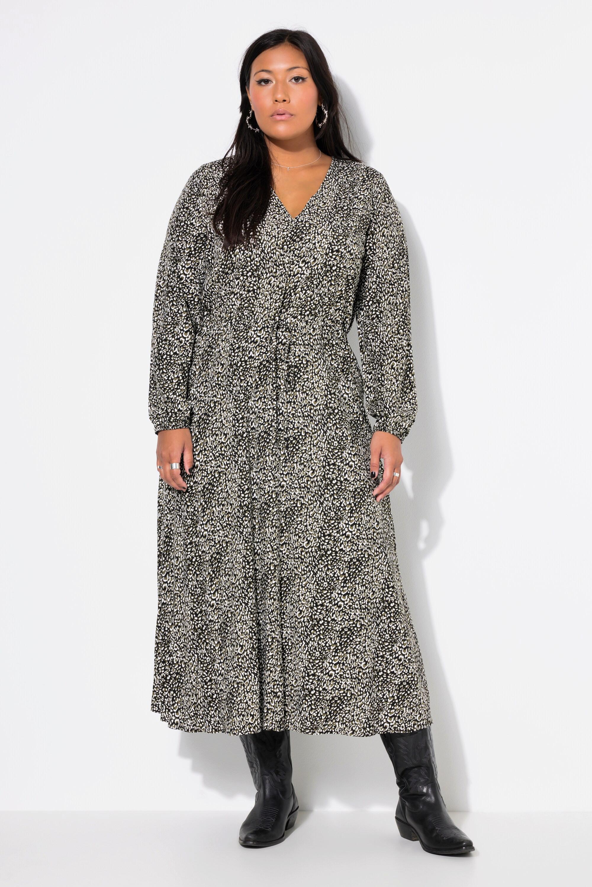 Dieses Maxikleid präsentiert sich in einer A-Linien-Silhouette und einer schmeichelhaften Wickeloptik, was es zu einer vielseitigen Ergänzung für jede Garderobe macht. Die langen Ärmel und der V-Ausschnitt tragen zu seinem eleganten Design bei.