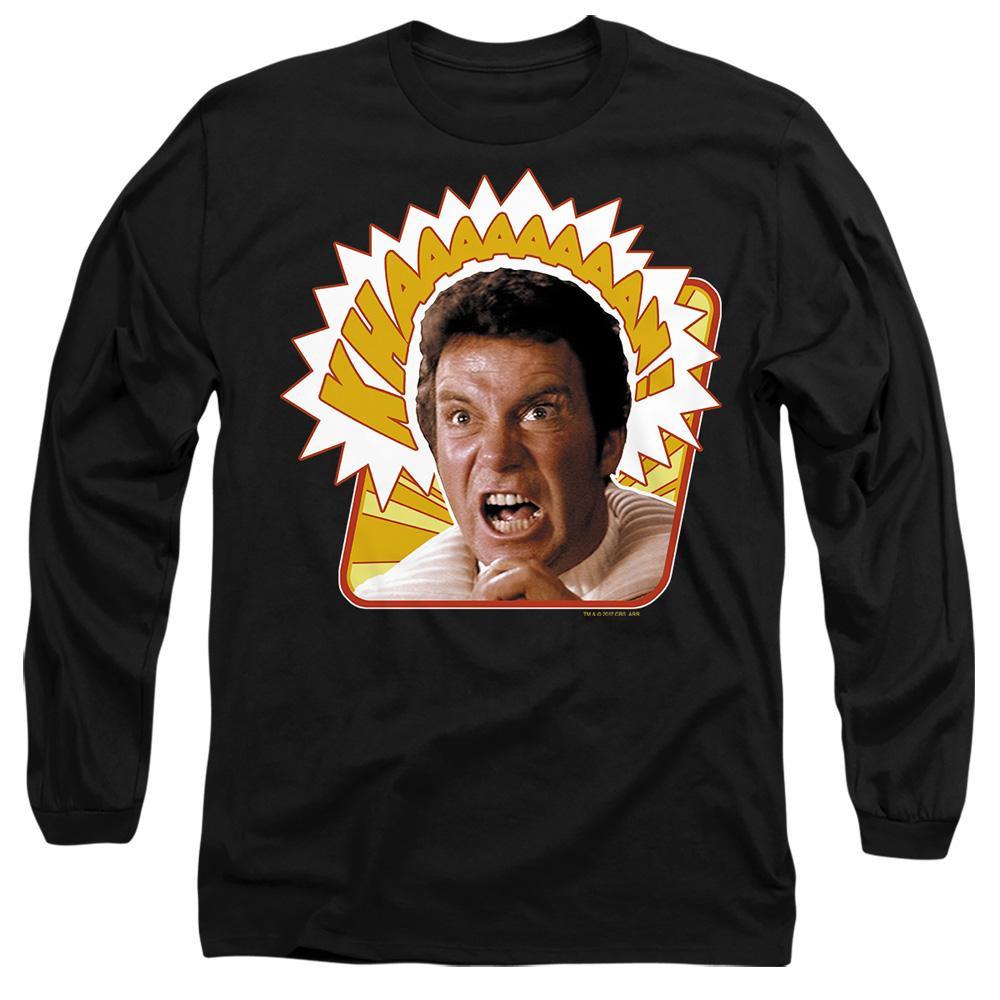 Dieses Langarm-T-Shirt zeigt einen auffälligen Grafikdruck von Captain Kirk aus Star Trek, der dramatisch "Khaaaaaan!" ruft. Das Design fängt einen ikonischen Moment ein und macht es zu einem herausragenden Stück für Fans. Das Shirt ist mit einem klassischen Rundhalsausschnitt und langen Ärmeln ausgestattet und bietet eine bequeme Passform für den Alltag.