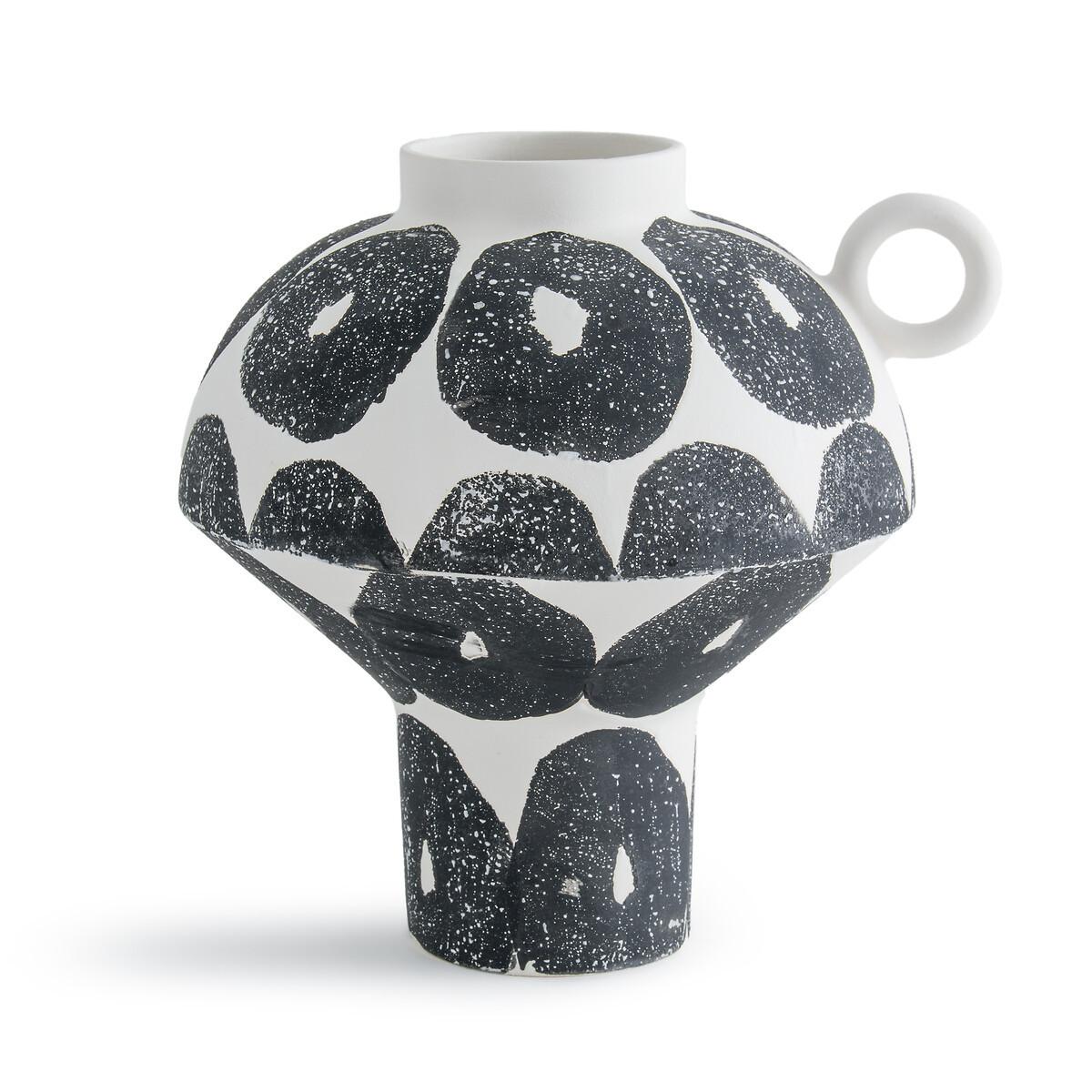 Die Poesie des Handgefertigten. Diese Vase changiert zwischen naiver und abstrakter Kunst. Durch ihr Design, ihr ultra-mattes Material und das Muster in Stempeltechnik. Sie wird in Handarbeit hergestellt, daher hat jedes Stück einen einzigartigen Look.