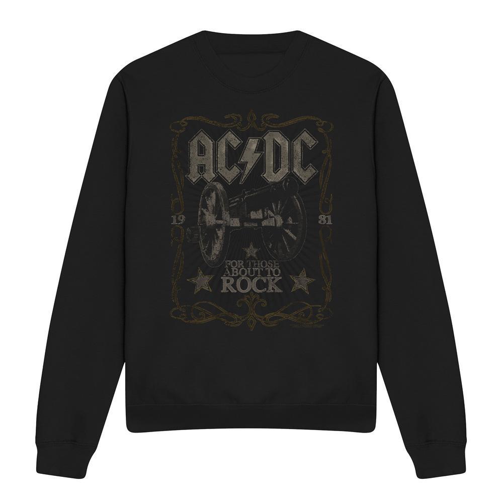 Dieses Sweatshirt verfügt über einen klassischen Rundhalsausschnitt und lange Ärmel und bietet eine bequeme und lässige Passform. Die Vorderseite ist mit einem markanten Grafikdruck verziert, der das ikonische ACDC-Logo und ein Vintage-inspiriertes Kanonendesign zeigt, umrahmt von dekorativen Schnörkeln und Sternen. Der Used-Look des Drucks trägt zu seiner Rock'n'Roll-Ästhetik bei und macht es zu einem herausragenden Kleidungsstück.