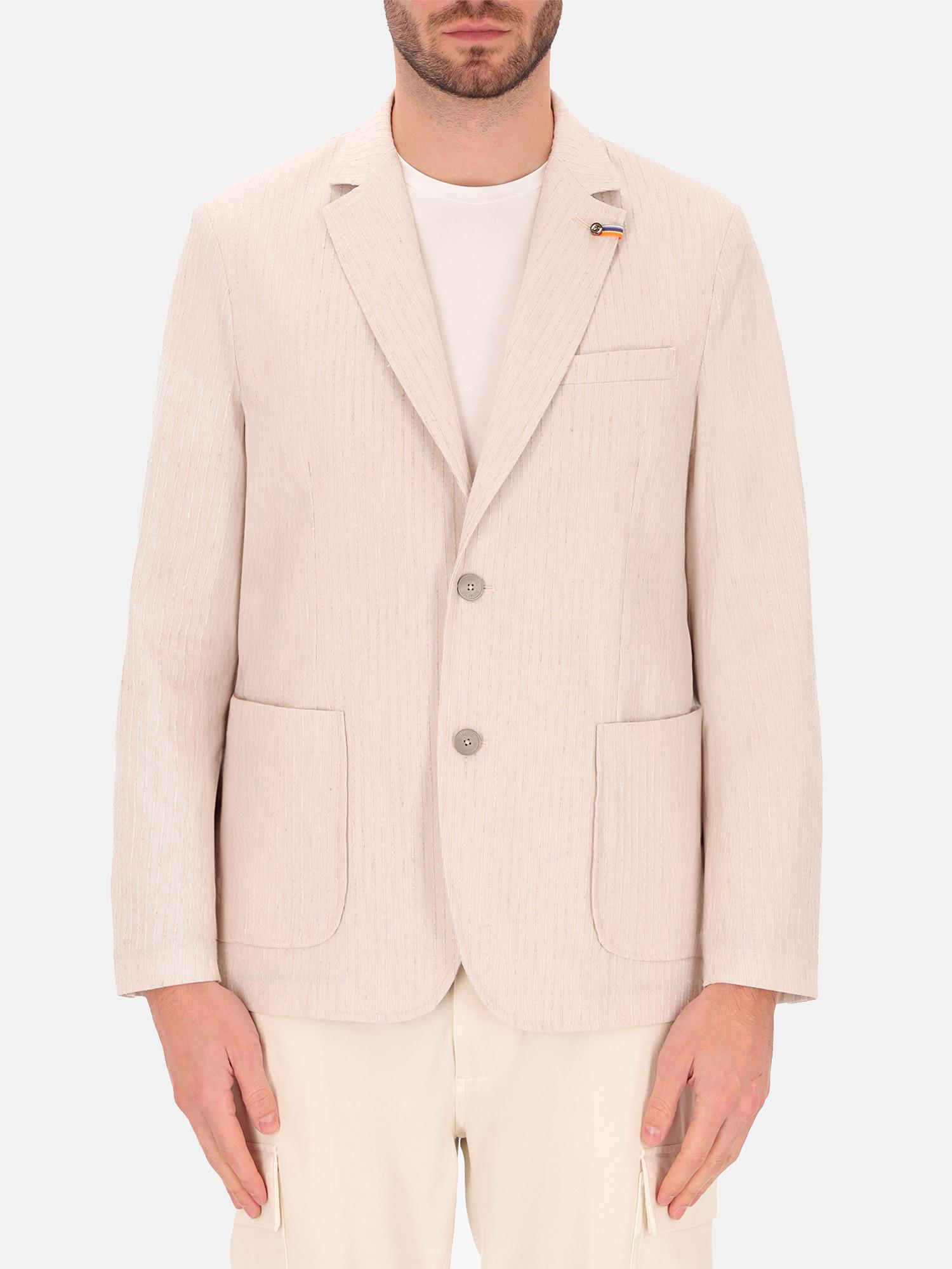 Diese einreihige Jacke ist aus superelastischem Faster12-Stoff mit Relief-Webstreifen gefertigt. Das Kleidungsstück hat einen kontrastierenden Unterkragen, eine vordere Öffnung mit zwei Knöpfen, aufgesetzte Vordertaschen und eine Brusttasche. Der Innenraum ist ungefüttert mit kontrastierenden Kanten und einer Nylontasche.