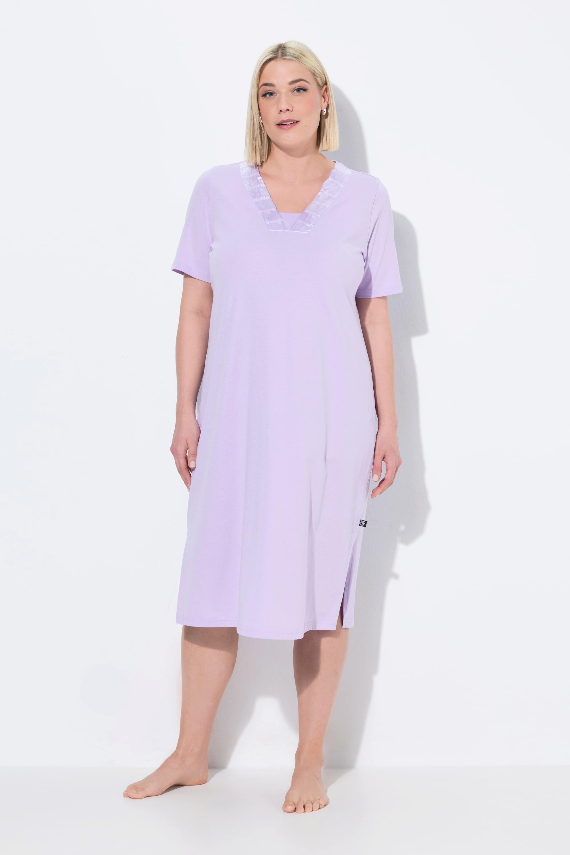 Dieses Nachthemd bietet eine bequeme Passform, perfekt für entspanntes Tragen. Es verfügt über einen V-Ausschnitt mit schimmernder Satin-Zierblende und Halbarm, sowie Seitenschlitze für noch mehr Tragekomfort.