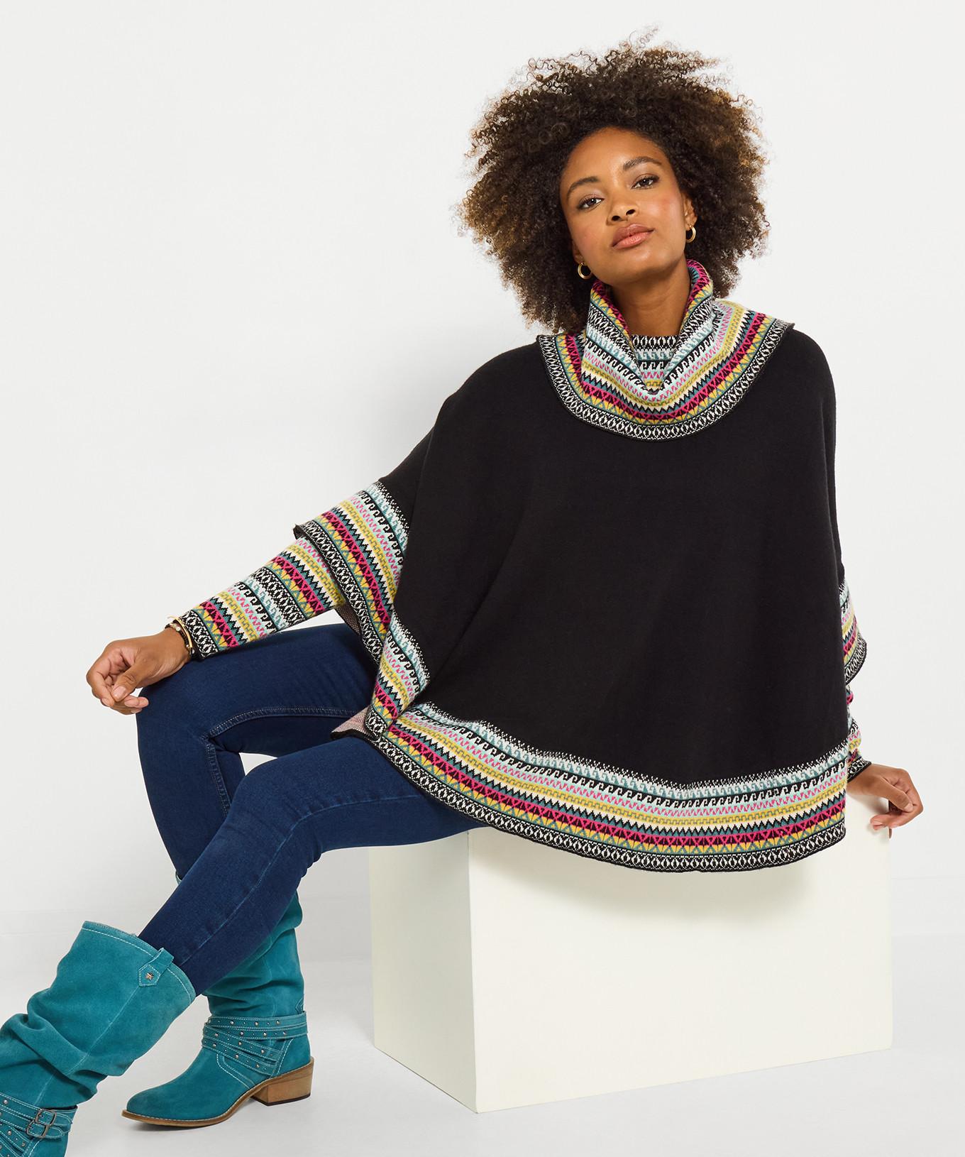 Dieser Poncho-Pullover zeichnet sich durch eine entspannte Passform und ein lebhaftes, mehrfarbiges Muster entlang des Ausschnitts, der Ärmelbündchen und des Saums aus. Das Design bietet eine bequeme und stilvolle Option zum Überziehen.