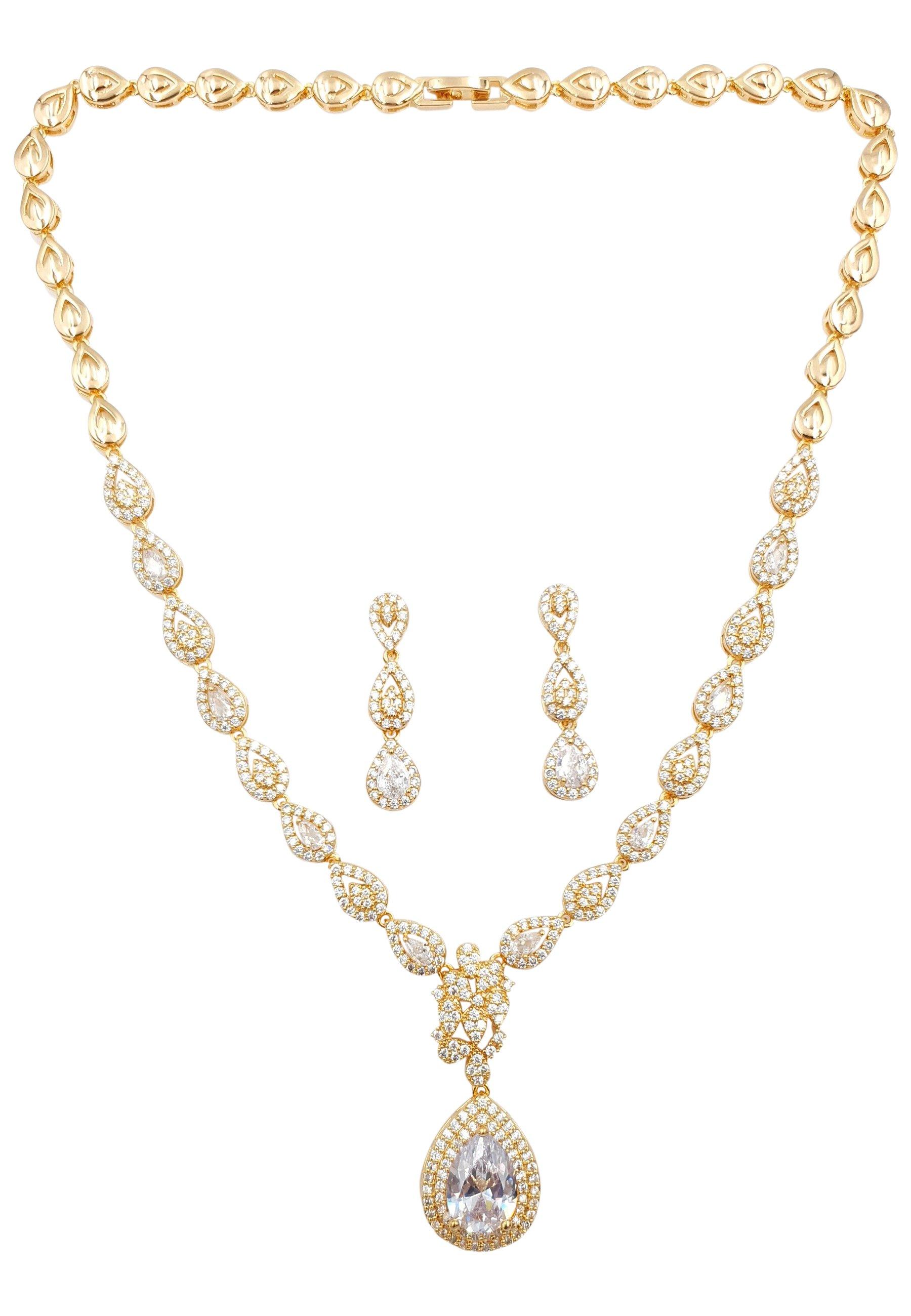 Das elegante Schmuck Set besteht aus einem Collier und Ohrringen. Das Collier sowie die Ohrringe wurden aus vergoldetem Messing und Zirkonia hergestellt. Das Collier ist 44 cm lang. Der Anhängerteil des Colliers ist 4.5 cm lang. Das Collier wiegt 32 Gramm. Die Ohrringe sind 3.4 cm lang und wiegen zusammen 4.5 g (2.25 g pro Ohrring). Der Stift des Ohrrings ist aus Sterling Silber.