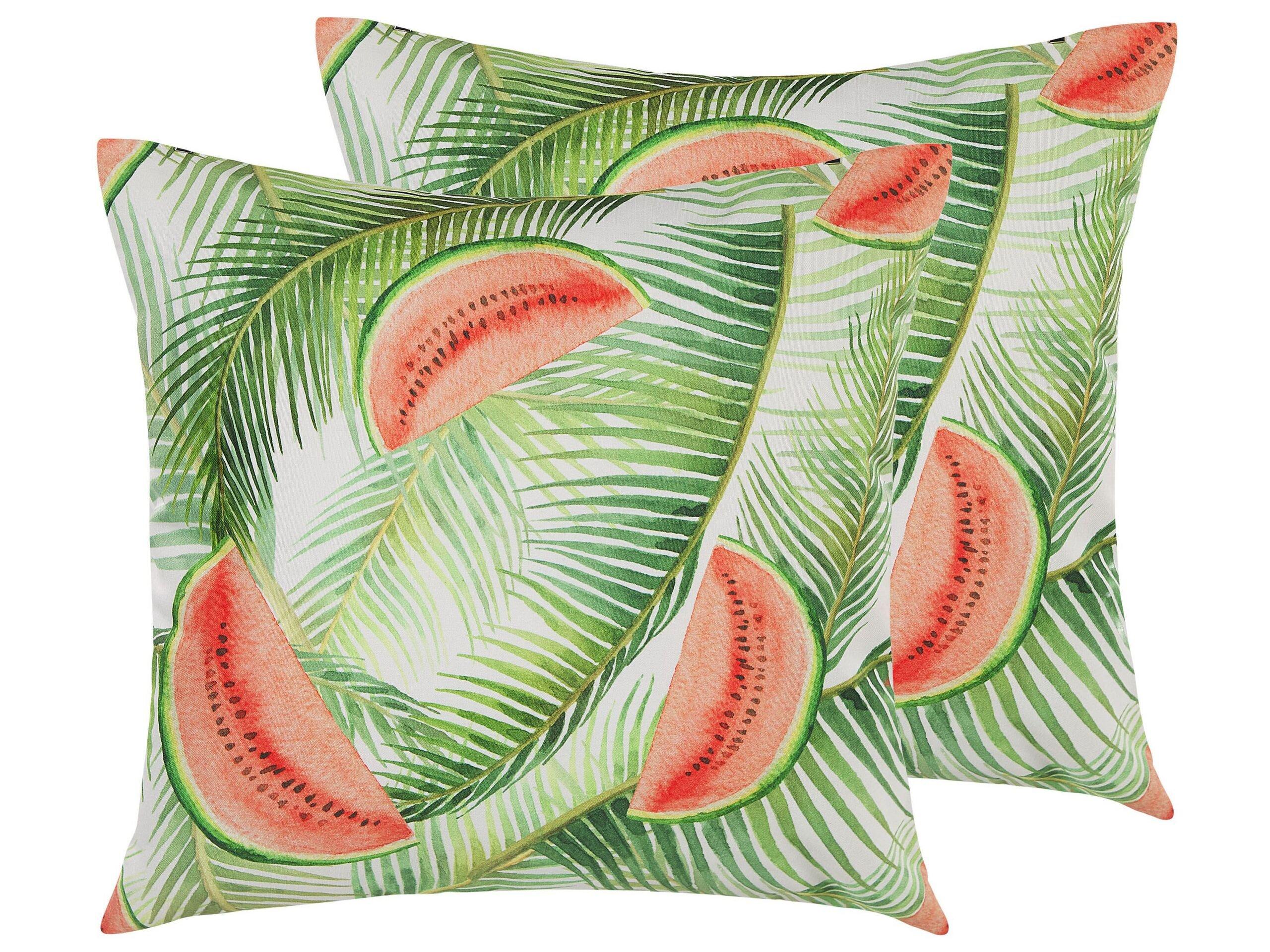 Zwei fröhliche Gartenkissen mit fruchtiger Melone und tropischen Blättern. Bereichern Sie Ihre Gartenmöbel mit diesen beiden quadratischen Zierkissen, die mit ihren Mustern für einen sommerlichen Look sorgen. Sie sind aus hochwertigem Stoff gefertigt und eignen sich nicht nur für den Aussenbereich, sondern auch für Wohn- und Schlafräume. Dank der Reissverschlüsse lassen sich ihre Bezüge abnehmen und reinigen. Zudem zeichnen sich die Kissenhüllen mit ihrer Feuchtigkeitsbeständigkeit und UV-Resistenz aus.
