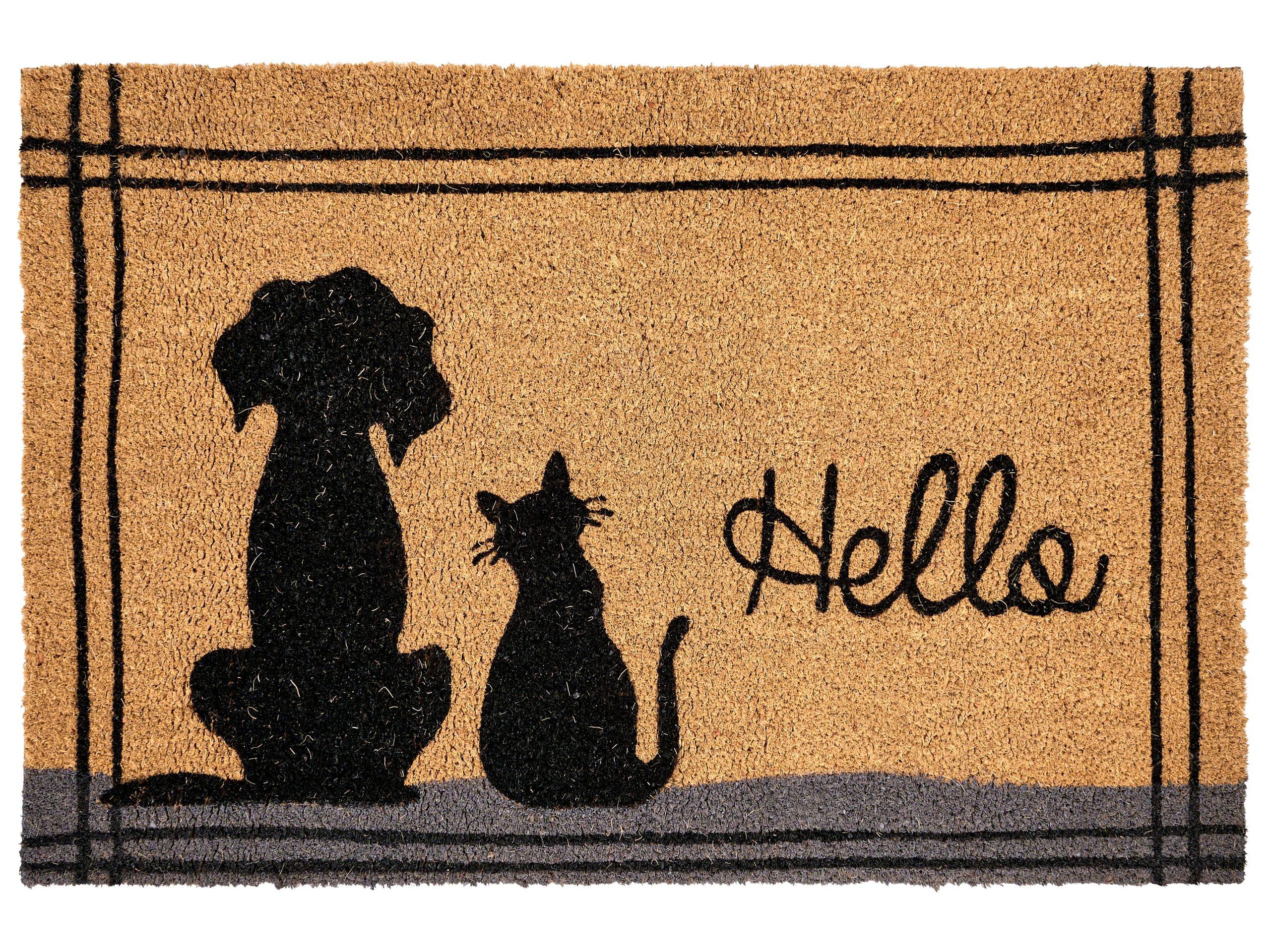 Rechteckige Indoor-Fussmatte mit Tiermotiv und Anti-Rutsch-Rückseite. Mit diesem modernen Fussabtreter und seinem zauberhaften Tiermotiv gelingt es Ihnen, Ihren Eingangsbereich noch einladender zu gestalten. Er ist aus grober Kokosfaser gefertigt und mit einer rutschfesten Unterseite versehen, die ihn an Ort und Stelle hält, damit Sie und Ihre Gäste sich beim Eintritt komfortabel die Schuhe putzen können. Mit einem verspielten Katzen- und Hundemotiv sowie dem freundlichen Schriftzug Hello begrüsst die Fussmatte jeden Ihrer Gäste egal ob Zwei- oder Vierbeiner. Somit ist sie auch die perfekte Wahl für alle Deko-, Interior- und Tierliebhaber.